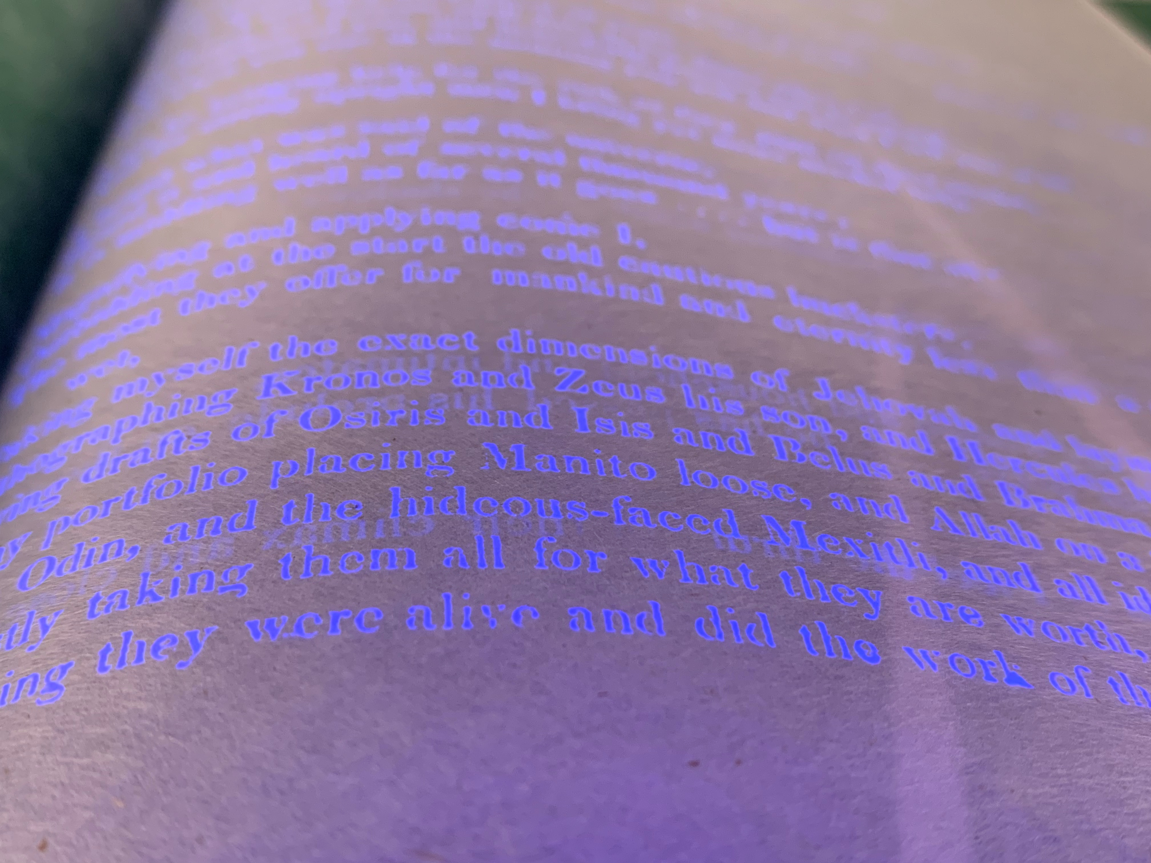 Colophon: A silent leaf. This edition of Leaves of Grass. has been printed off the 4th of March 2026. 50 numbered and signed copies by Didier Mutel are printed on gampi paper with photoluminescent ink only readable if revealed by UV light. The binding and the 42 monotypes are by Didier Mutel.