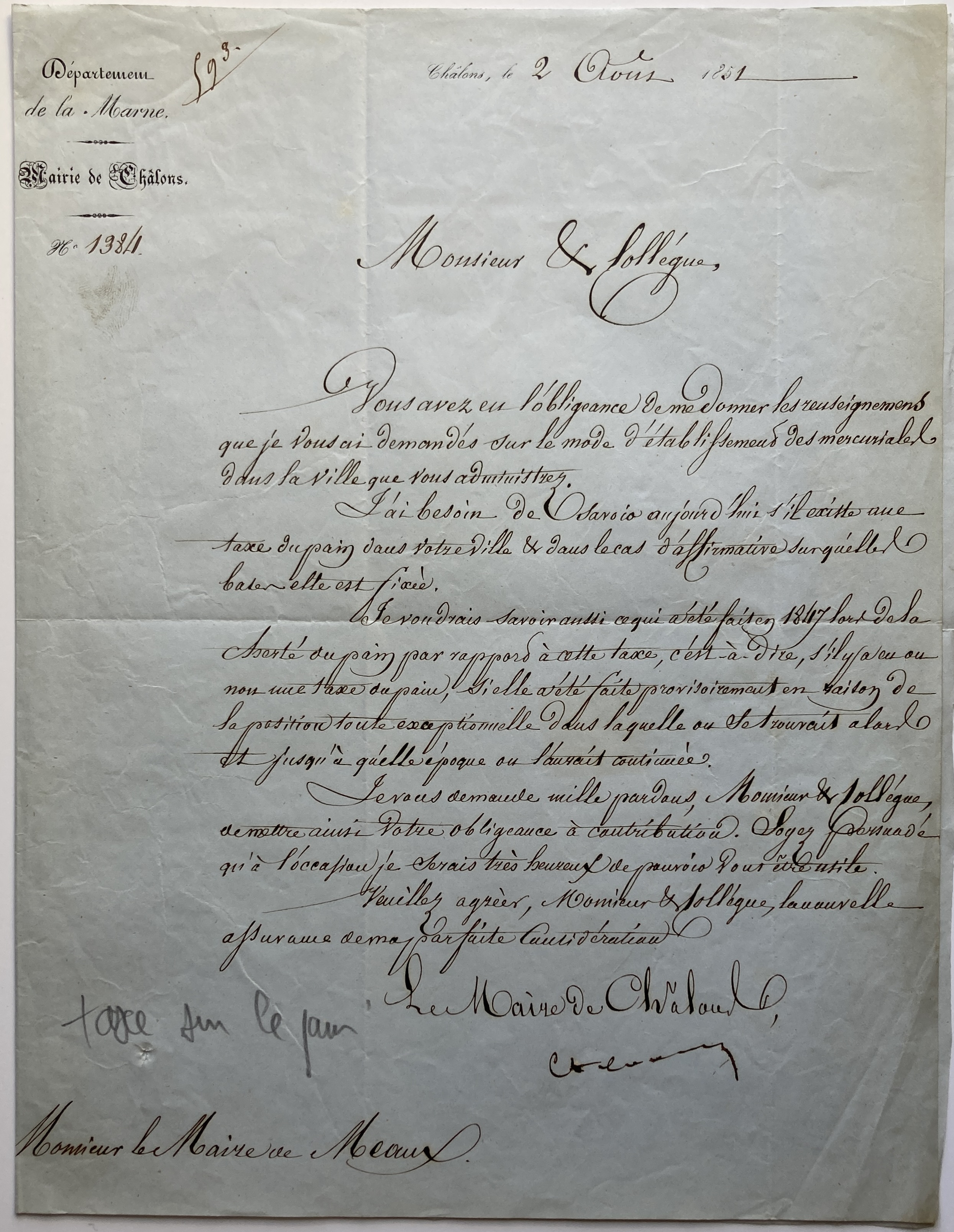 A selection of manuscript and printed items all related to the production, pricing, and taxation of bread in France, including documents for home ovens, a patented breadmaking machine, a real estate flyer for an extensive flour mill, etc.