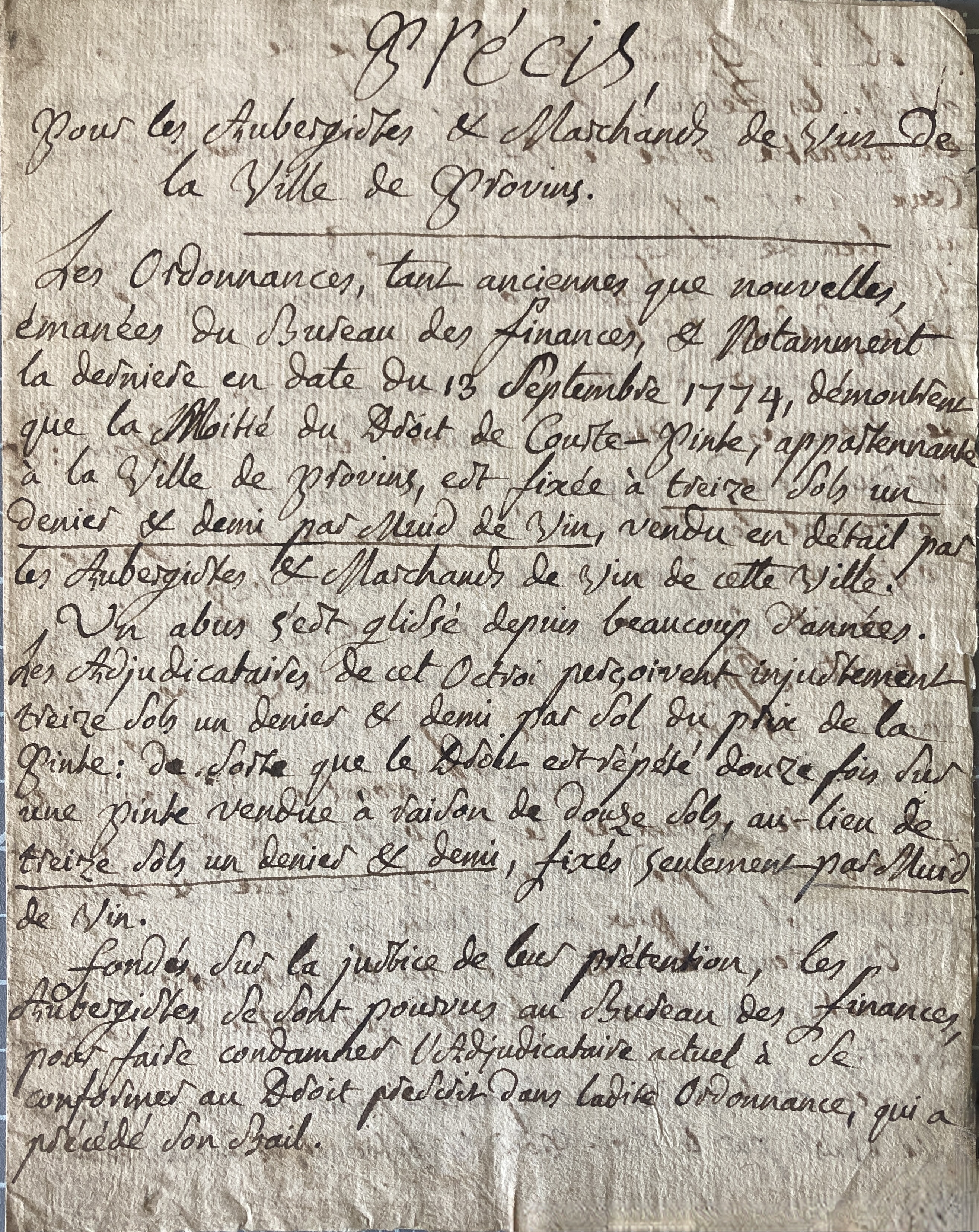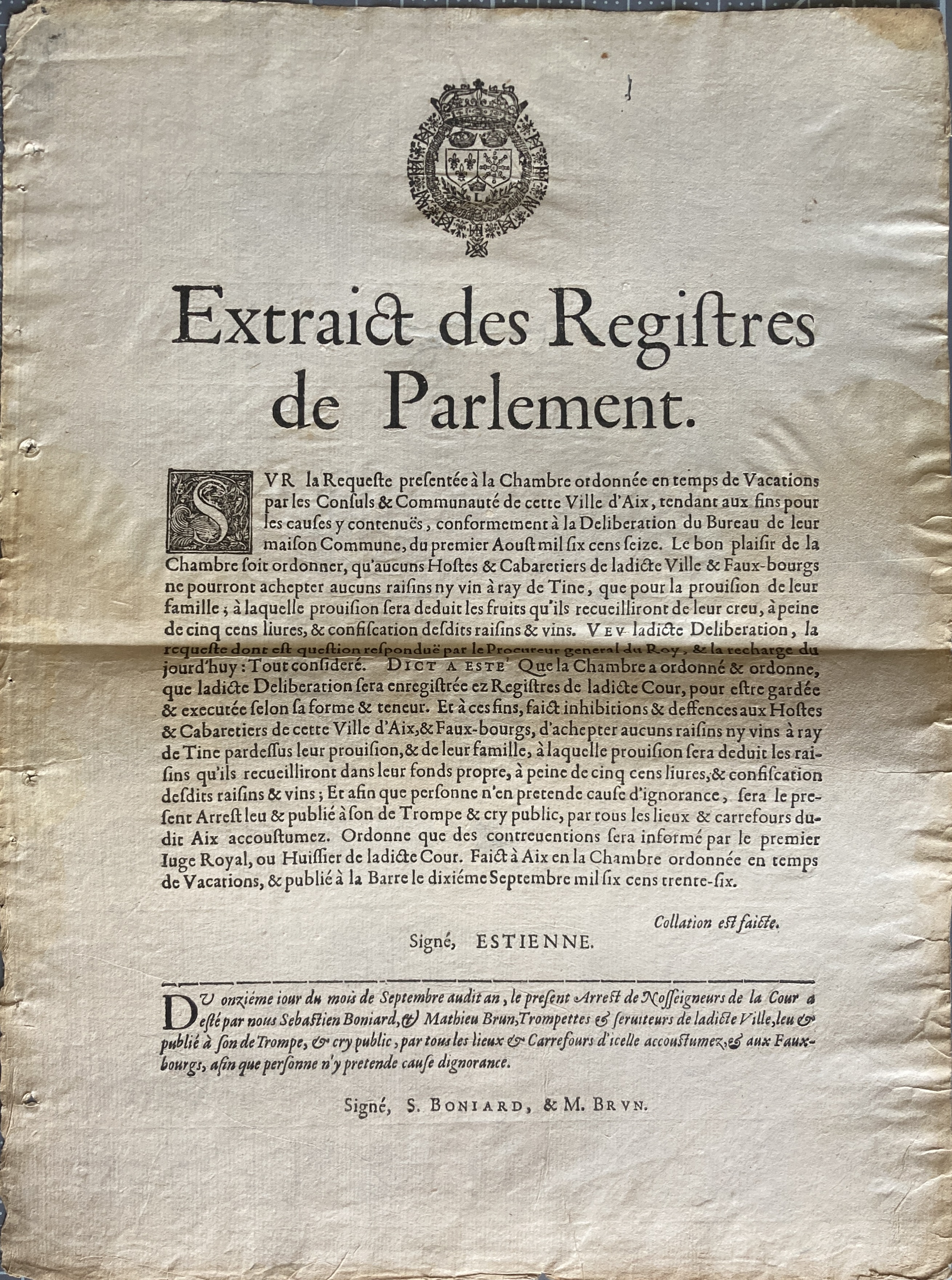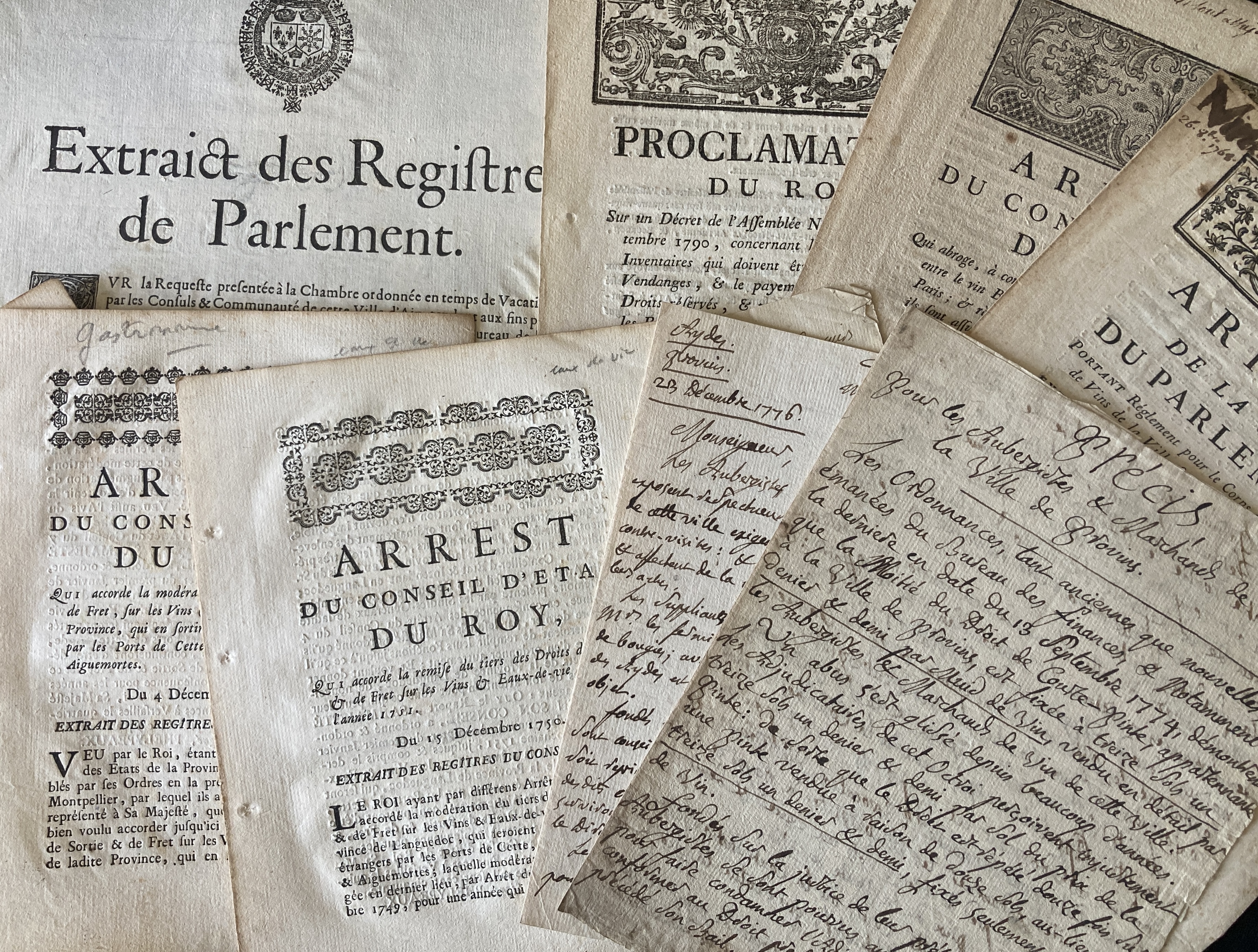 4 manuscripts and 7 printed documents related to laws and regulations governing wine production and sales. Related primarily to legal matters governing the wine industry in France during the 18th century, and in one case the early part of the 17th century.