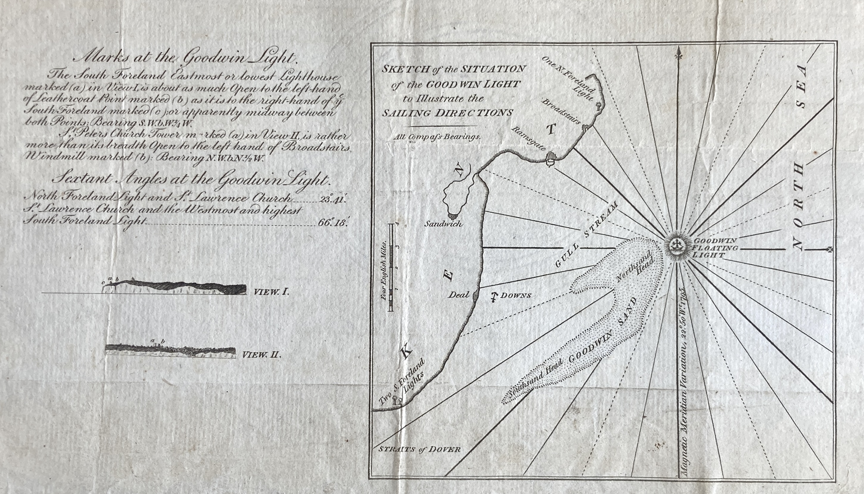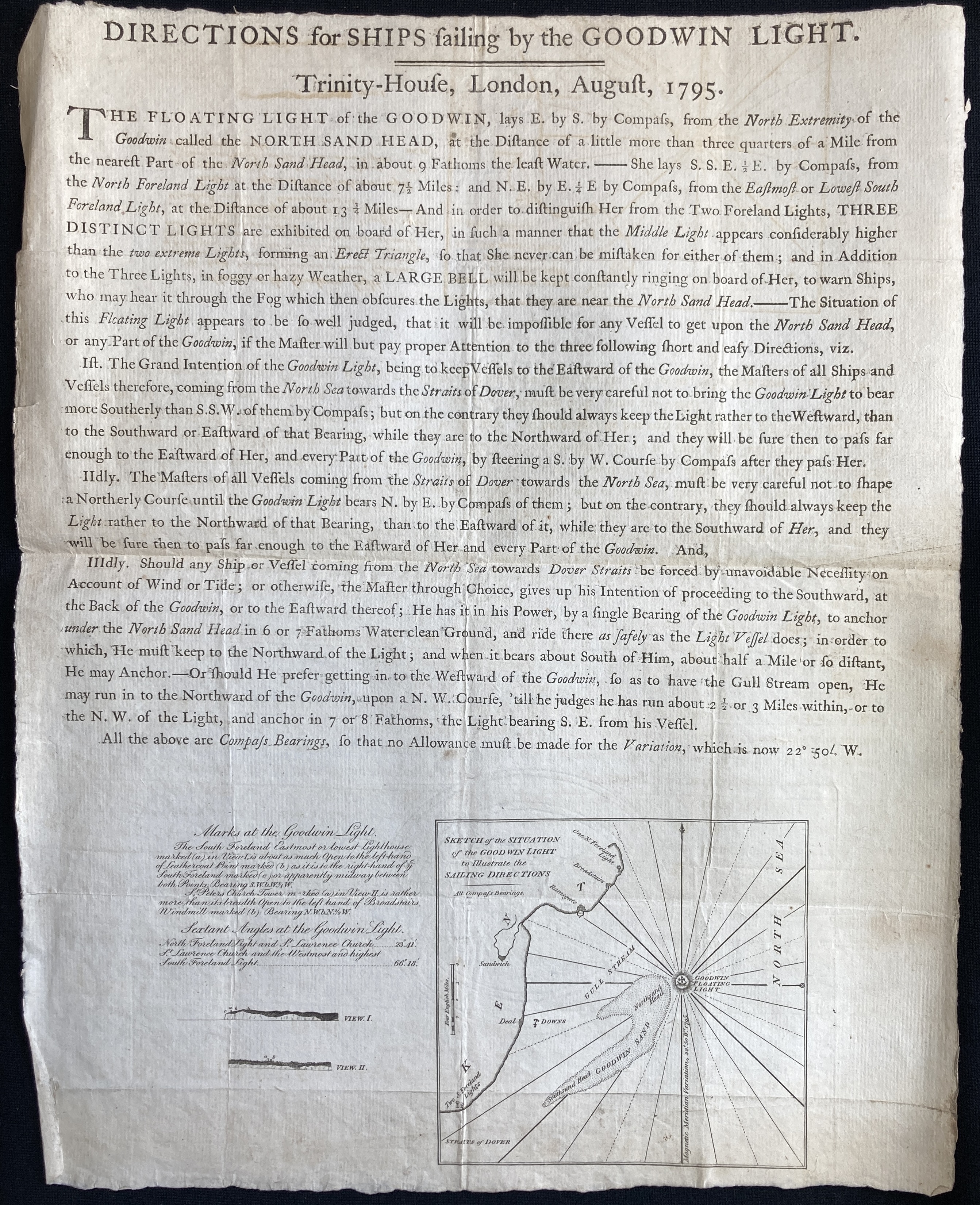 This document, published by the lighthouse authority Trinity House in the year that the Goodwin Light was first established (1795), provides detailed instructions for ships sailing along the English coast for navigation around the Goodwin Sands, a 10-mile long sandbank, by way of reference to the Goodwin Floating Light, six miles offshore to the east of Deal and southeast of Ramsgate. The document gives precise sea depths, visual descriptions, and sailing instructions for safe passage through the shallow water and sandbars of the Goodwin Sands. A navigational map complements the instructions and includes exact sexton coordinates for the Goodwin Light. These dangerous shallows have claimed as many as 2,000 ships over time—this document would have saved many ships from running a ground.