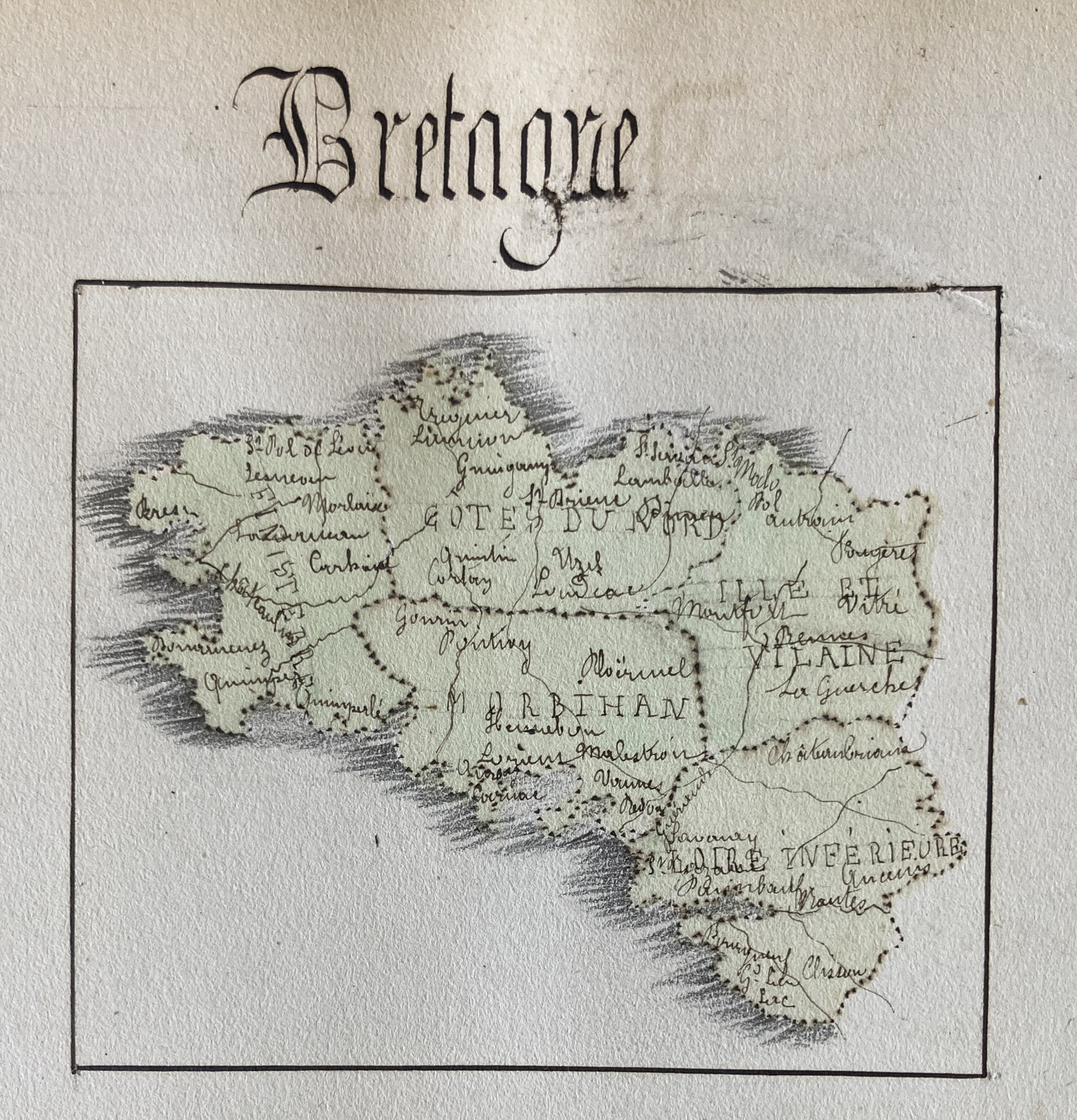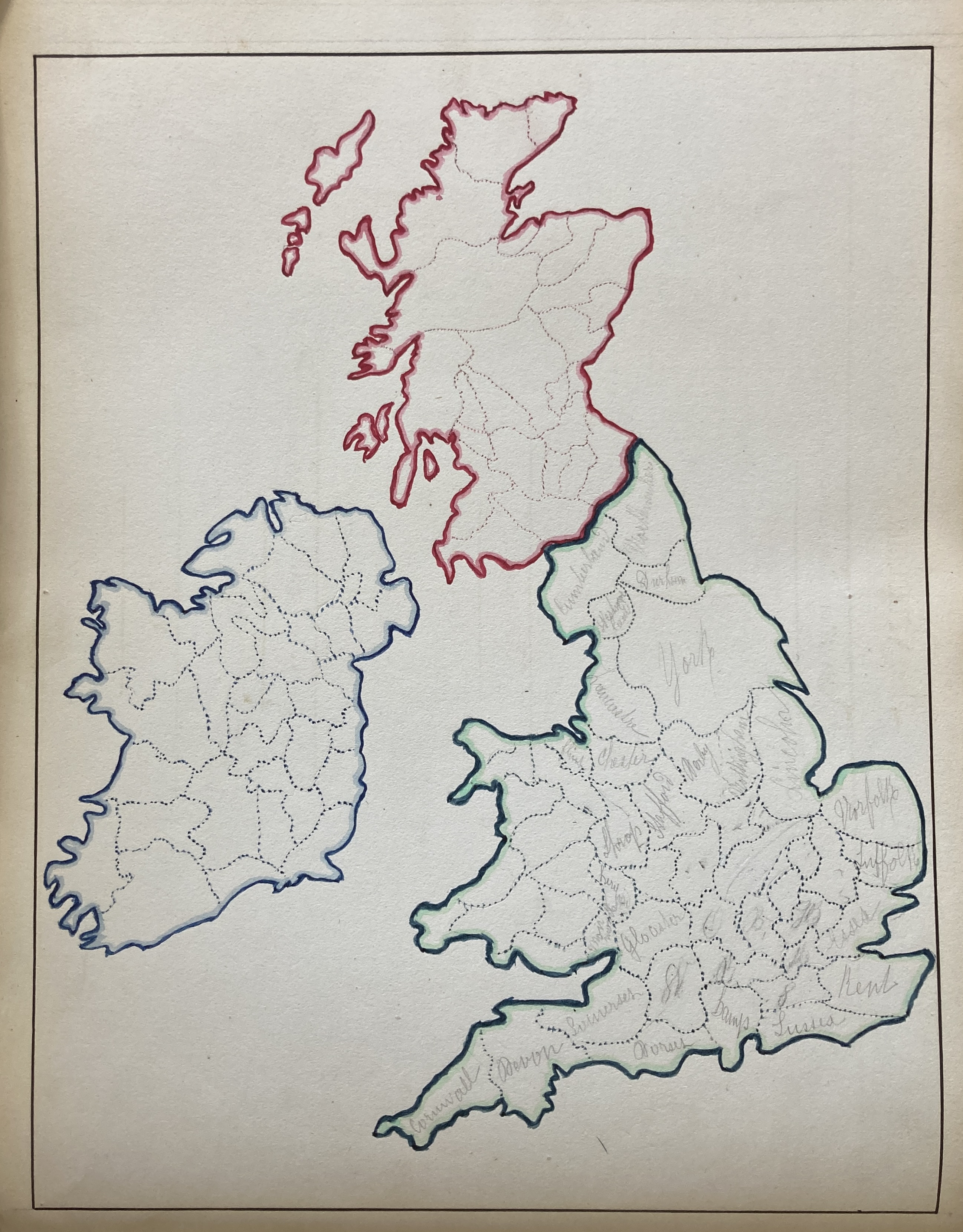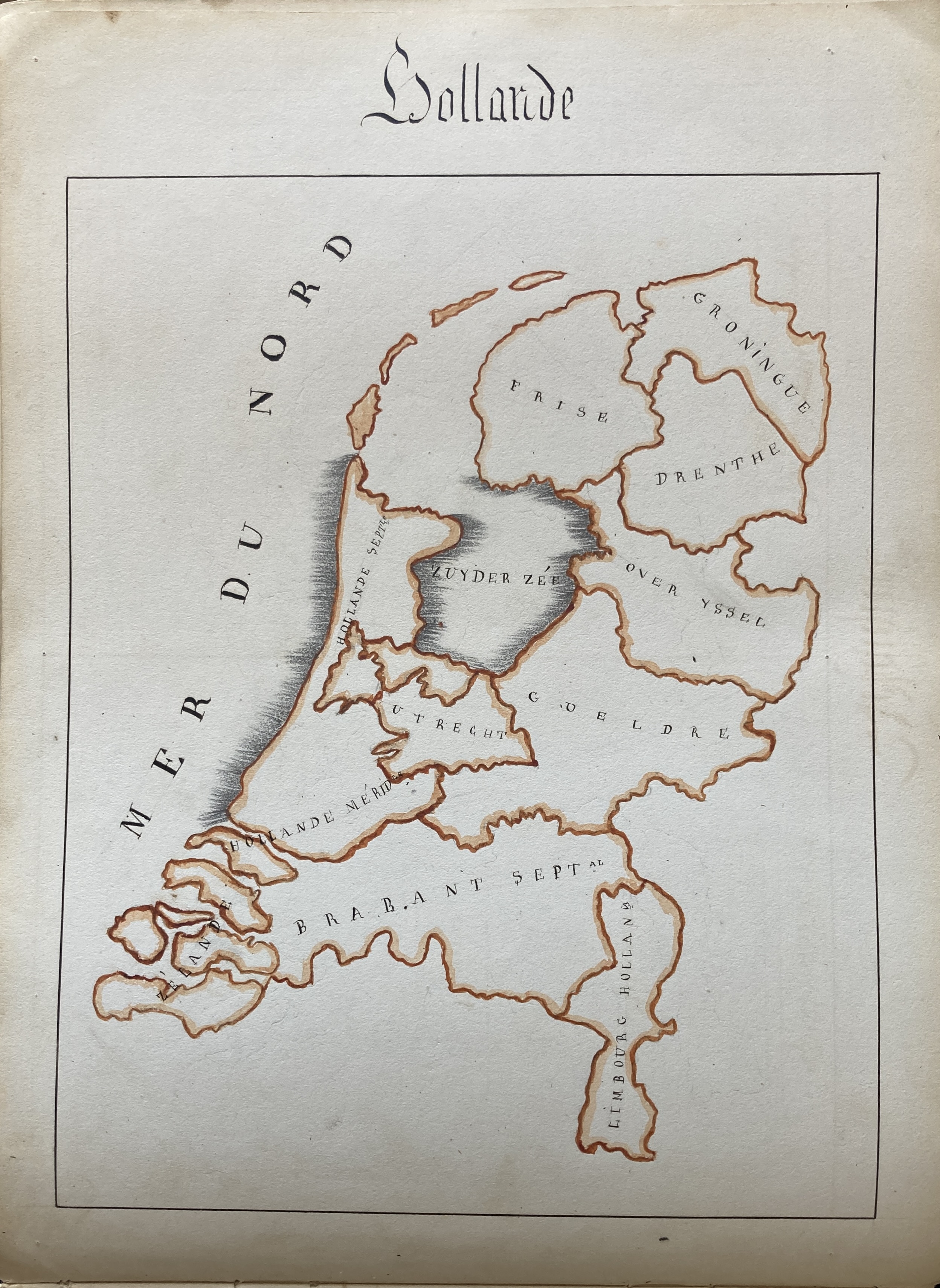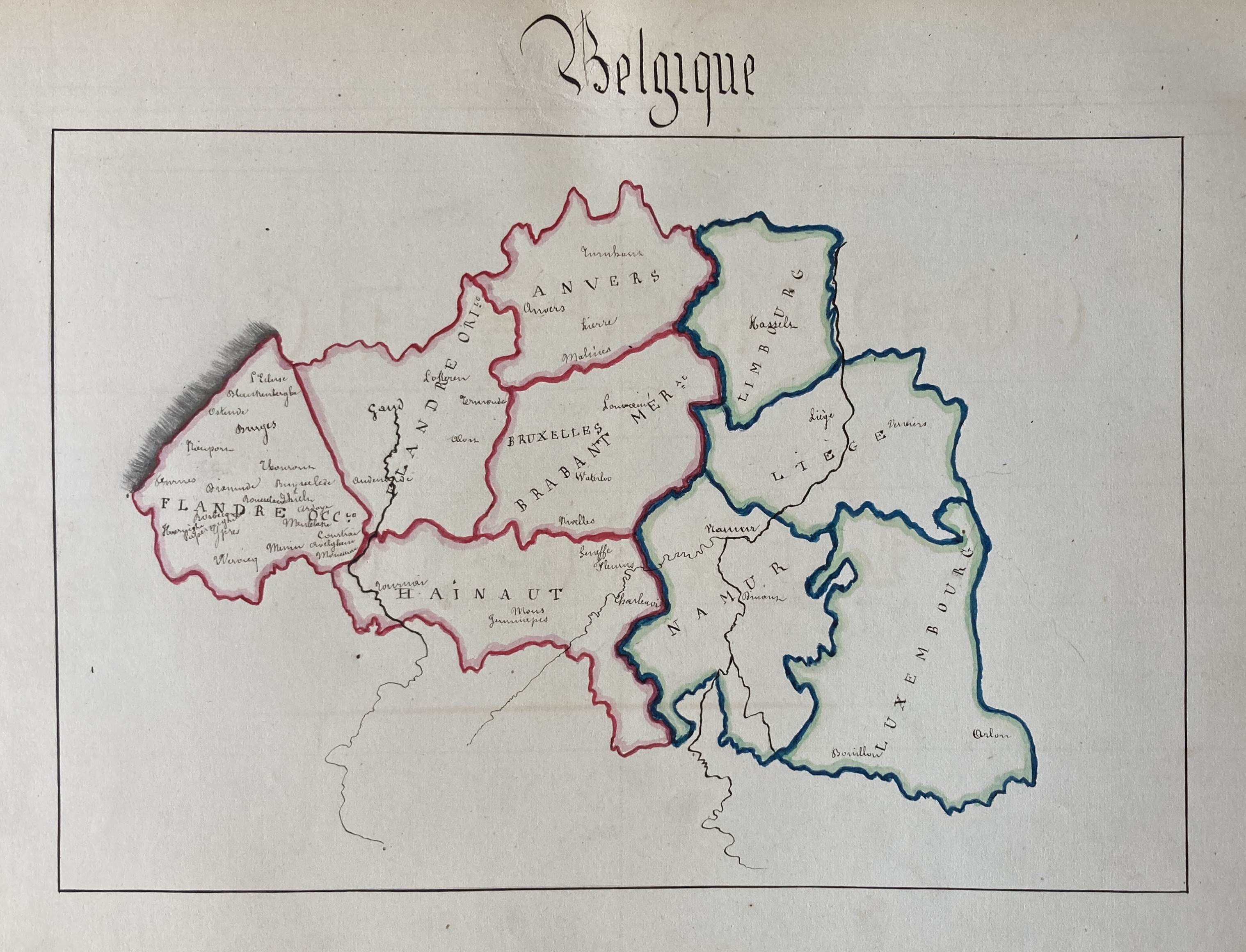 The volume is typical of French pedagogical practices in which students create formally designed book objects on the topic being studied, in this case with carefully hand-colored maps. The present volume offers a detailed account of 37 different regions of France, (Flanders, Alsace, Lorraine, Ile de France, Brittany, Normandy, Burgundy, etc.), each with a colored map, and 5 hand-colored maps for Belgium, the British Iles, Holland, Denmark, and Russia, with blanks leaves no doubt intended for maps of Switzerland and Sweden.