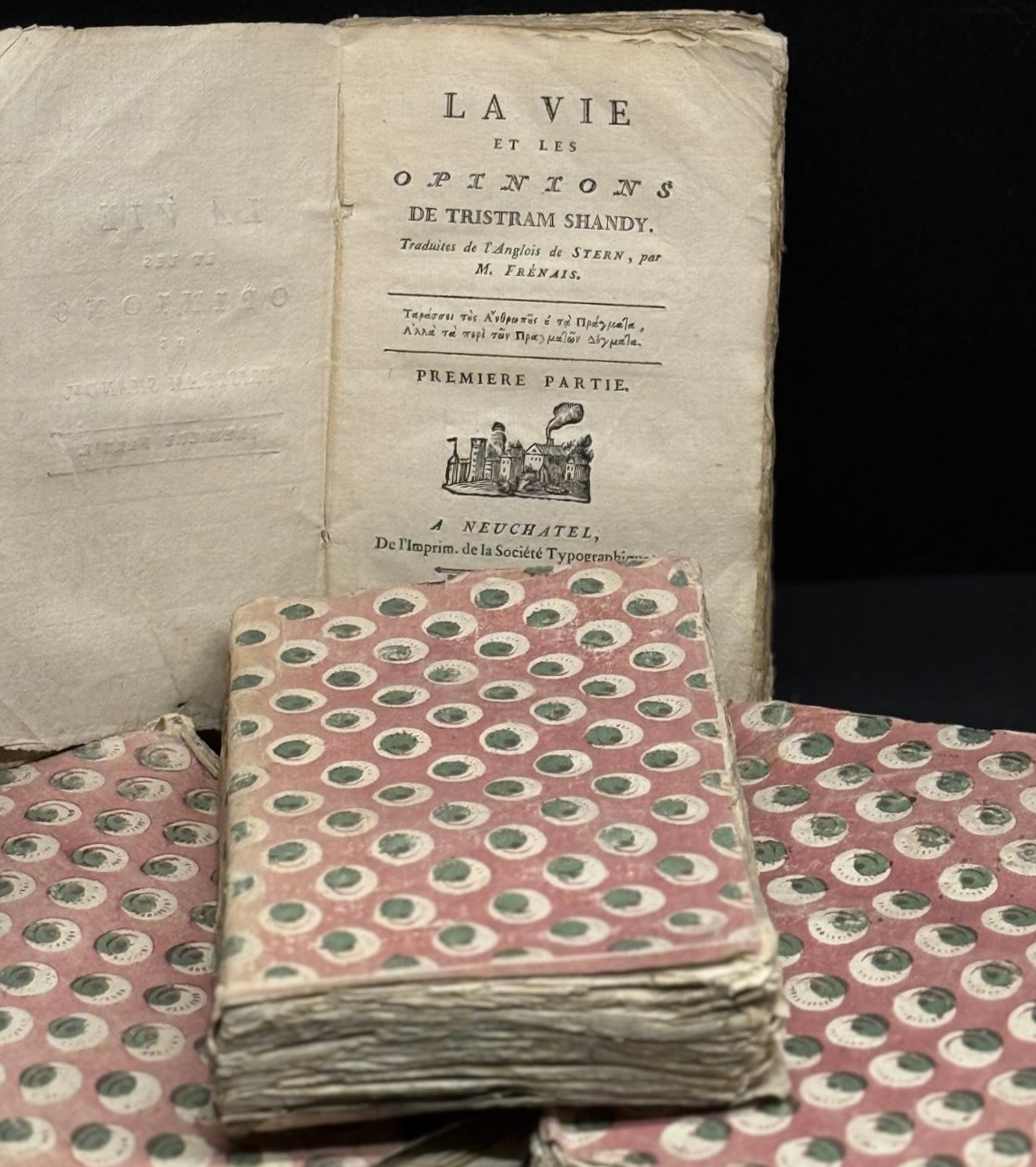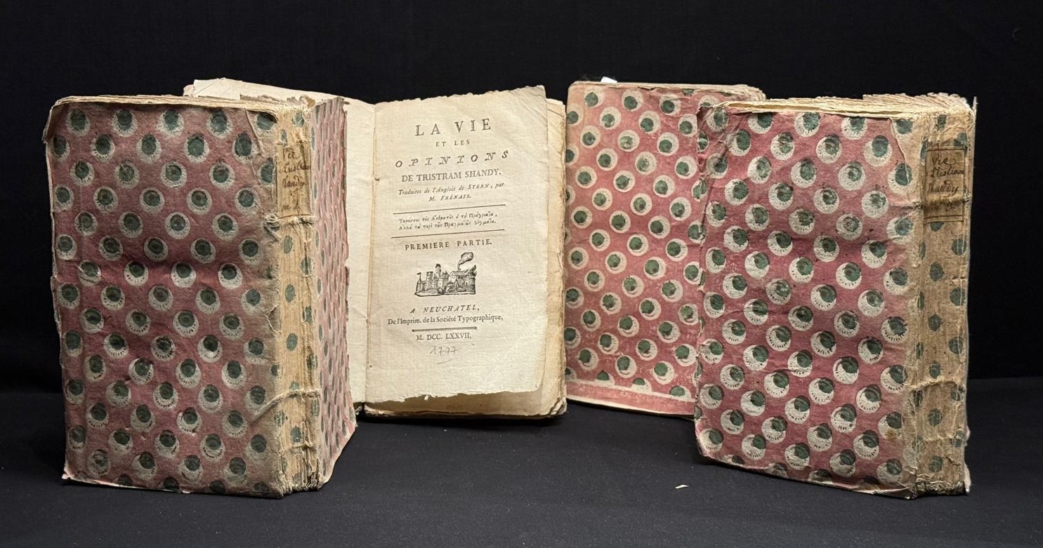 Laurence Sterne’s masterpiece translated into French: a most attractive copy, as issued, untrimmed, with hypnotically charming contemporary decorated paper wrappers.