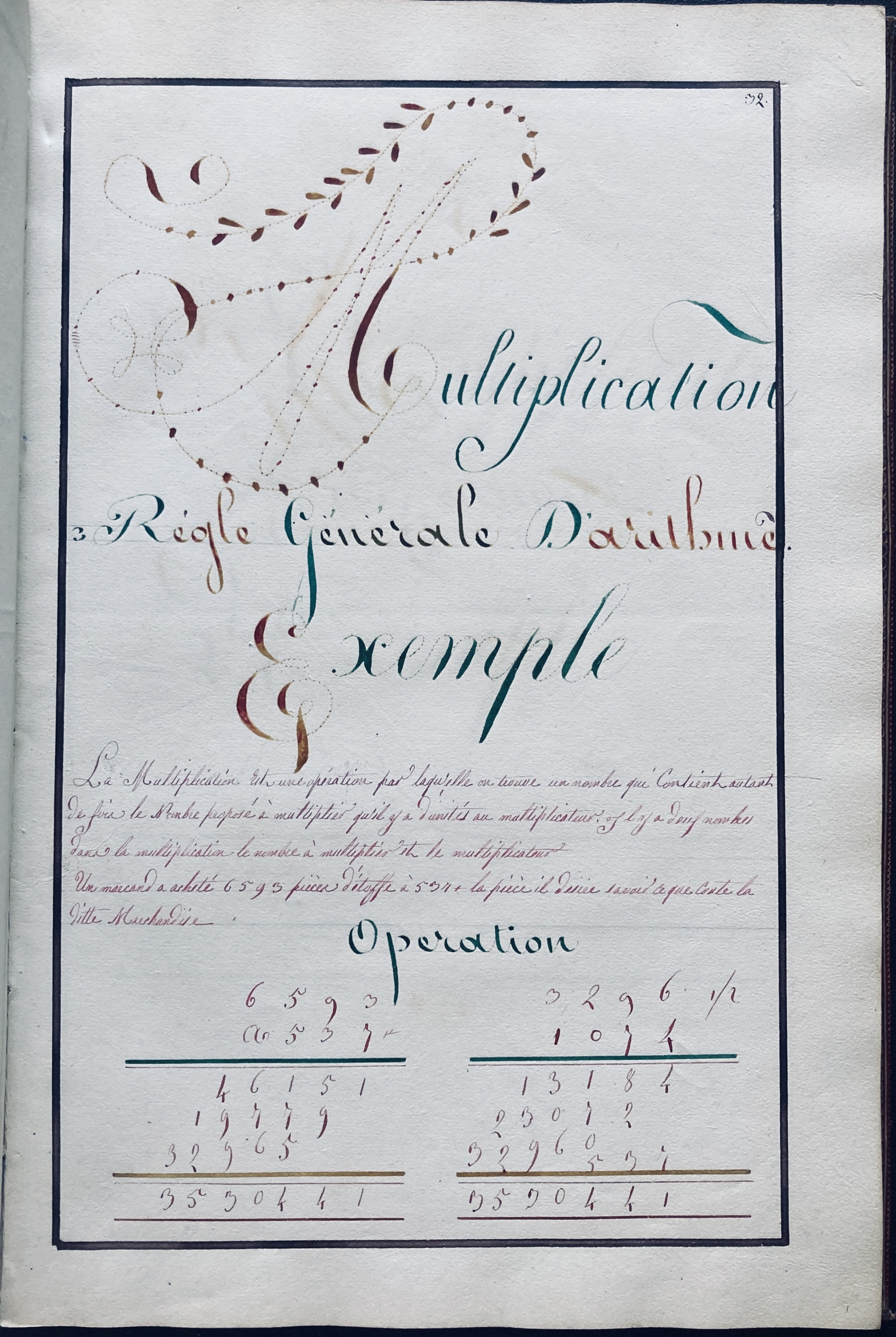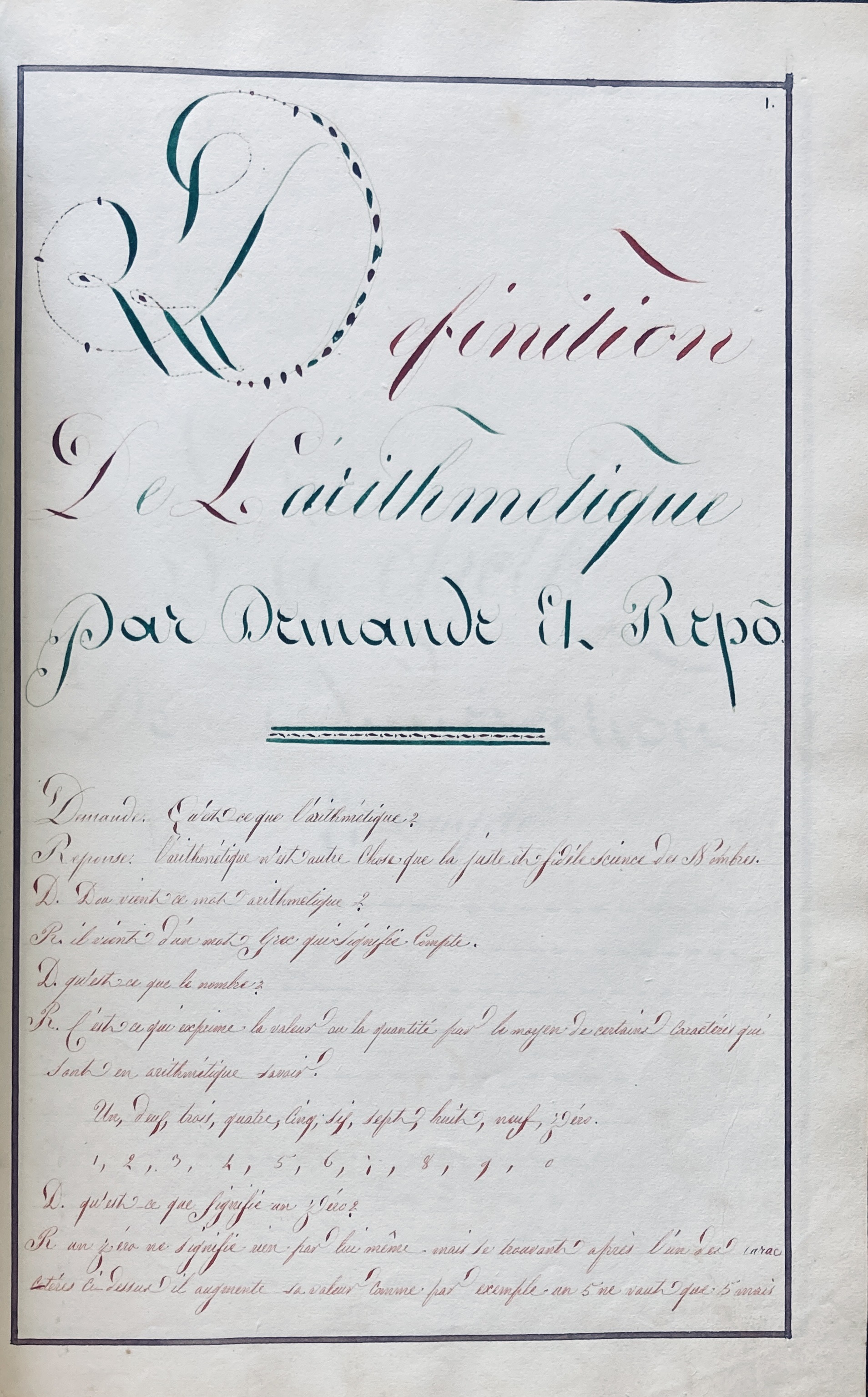 The material aspect of this unusually luxurious textbook—gilt stamped morocco binding and liberal use of paper (the exercises appear on the rectos only), tells us that Augustine must have been from a well-educated and well-to-do family. The carefully handwritten creation of this exercise book also demonstrates her competency in mathematics as well as penmanship. It is further noteworthy that a young woman's education in the early 19th century would include exercises in commercial business as seen here. The work opens with a pedagogical exercise on the principles of arithmetic in a Question and Answer fashion: the student has responded to a series of 32 questions, beginning with the question: “Qu’est ce que l’arithmétique [what is arithmetic]?” The table of contents lists over 60 essential exercises in all.