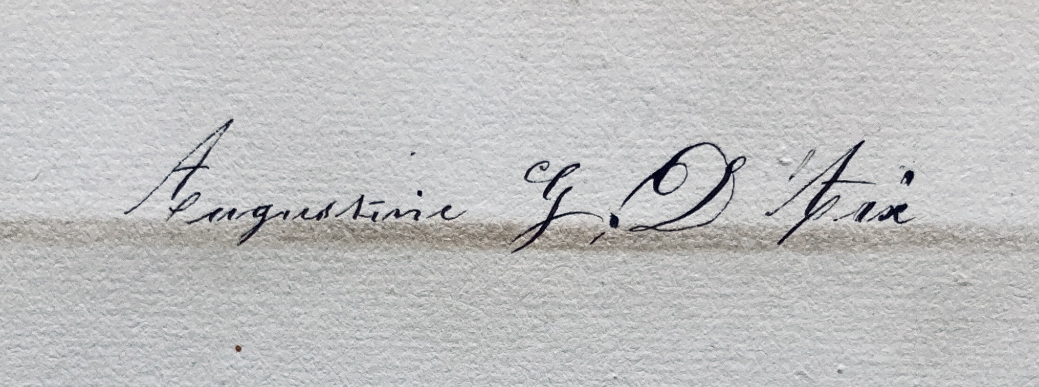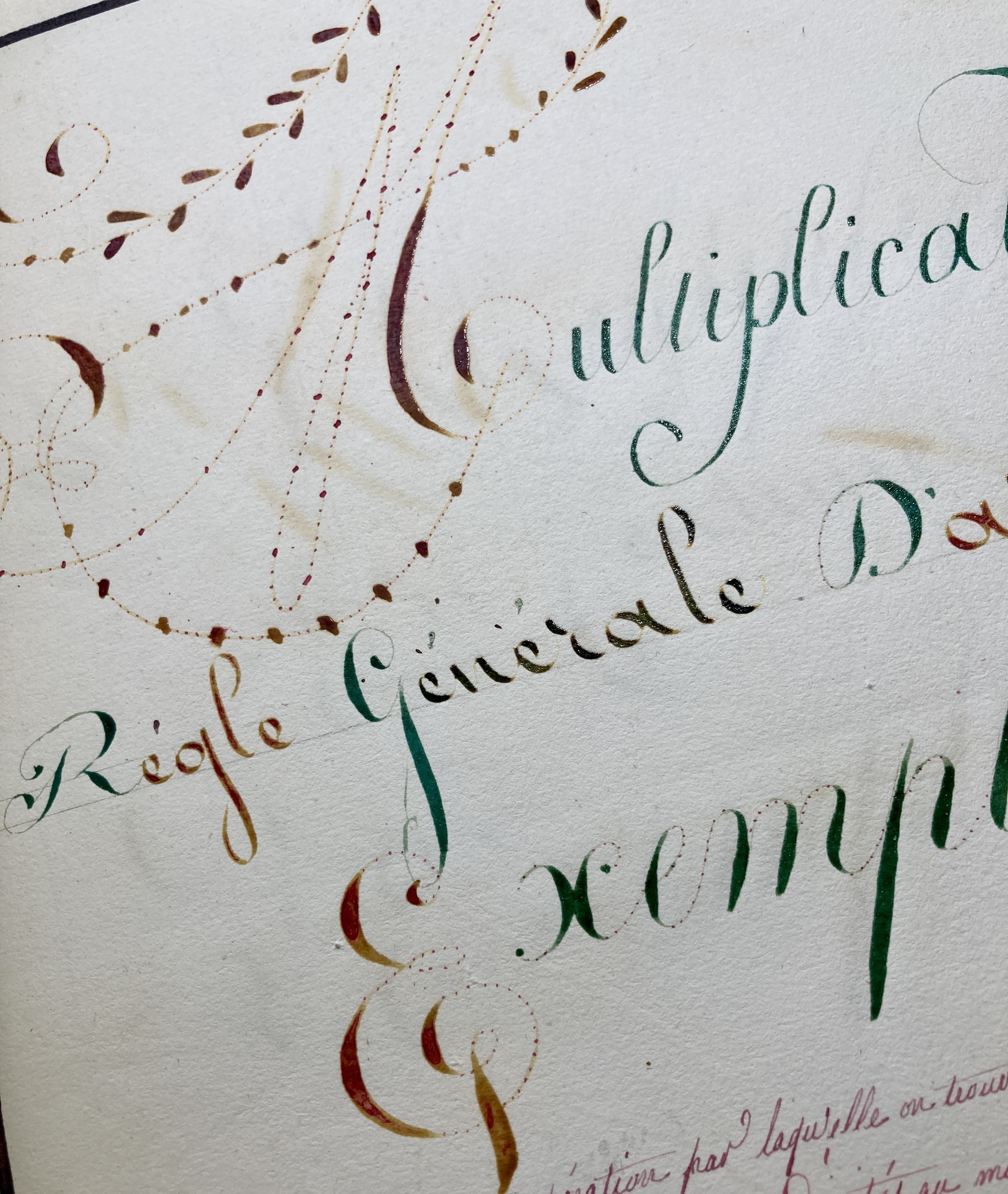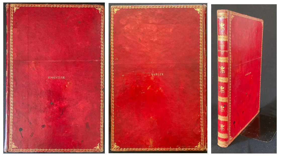 Folio: (34 x 22 cm). [5] blank leaves, 88 leaves (text), [4] leaves (table), 16 blank leaves—with text and exercises written on rectos only. Contemporary red morocco with gilt frames on the boards, flat gilt spine, and former owner / student’s name “Augustine” on the front cover and “Garcin” on the back cover, all edges gilt. A few scuffs and ink spots to an otherwise lovely binding, internally the volume is excellent. Written on fine Dutch paper with the D&C Blauw watermark, common to late-eighteenth and early-nineteenth century France; all text rectos with black ink borders, and one leaf (7) with ornamental borders. Signed at the end “Augustine G. D’Aix.”