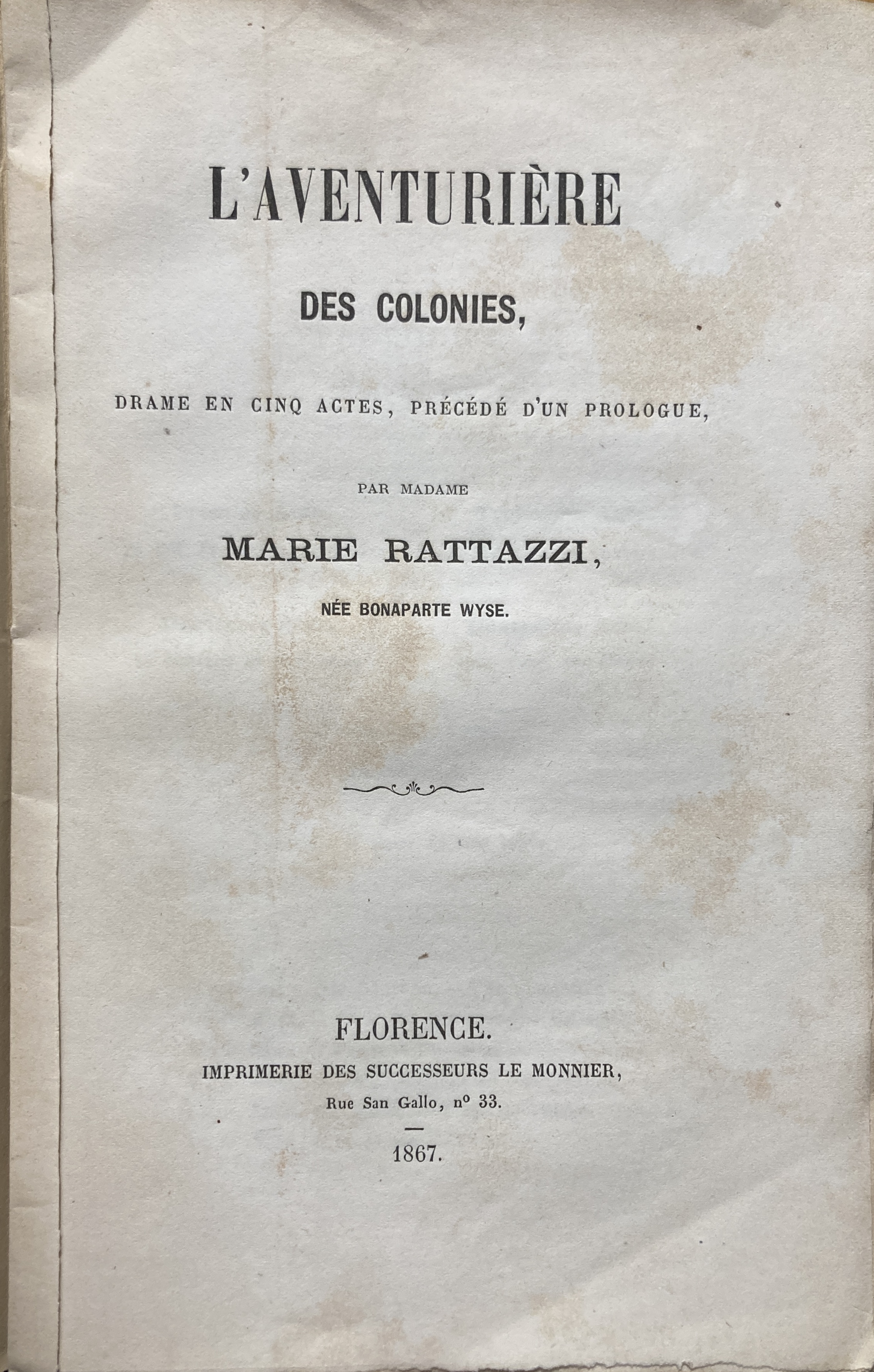 This five act play by Marie Rattazzi is based on her early novel, Les Mariages de la Créole , which was banned in France by Napoleon III, the author’s cousin, but published in Brussels, 1866. Rattazzi’s narrative is in fact a roman à clef based on the affair of Eugène Schneider, an industrialist, banker, politician, and ally of Napoleon III, and Marguerite Asselin [Magarthy in the play], his Creole mistress, and the marriage of Schneider’s son to Asselin’s daughter. After the banning of the novel, production of the play in France was impossible, so Rattazzi adapted it for the Italian stage while in exile there—published in Florence, for the present edition, then translated into Italian (Naples, De Angelis, 1868). A second edition was published in Paris, 1885.