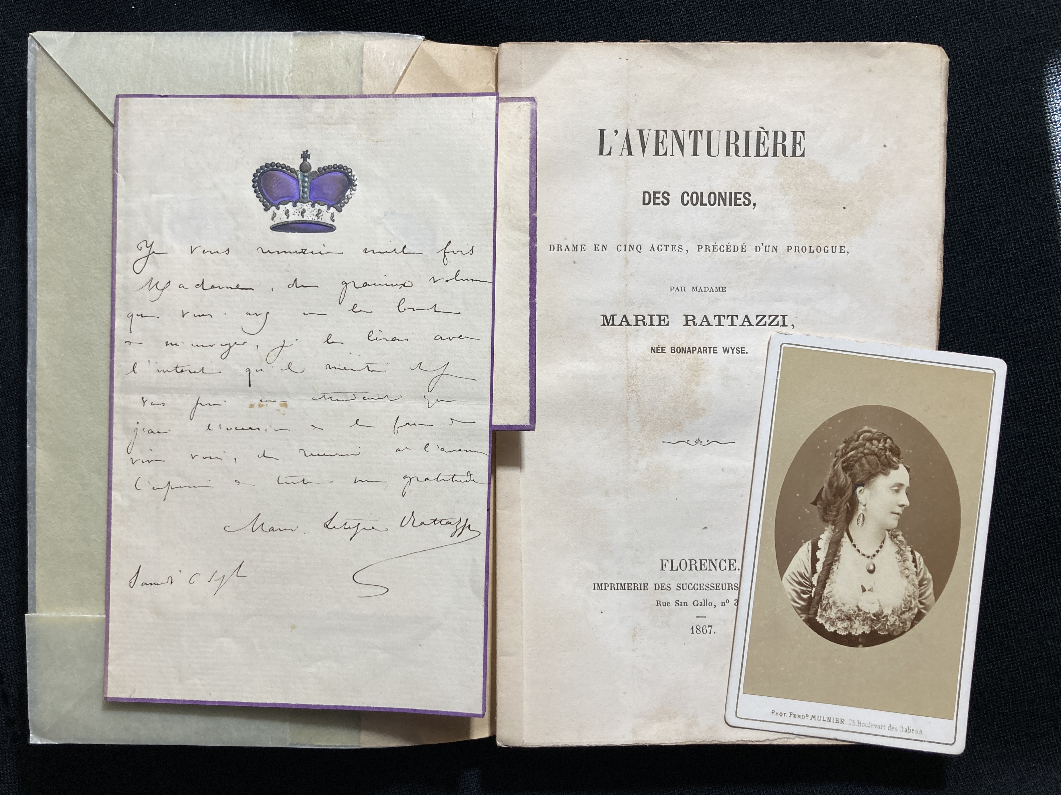 An autograph letter signed (1 p.) to Madame Marie Cellini, addressed to the Casino in Trouville, written on Rattazzi’s crowned stationery and envelop, to thank Cellini for sending her a book, “le gracieux volume” [likely Cellini’s Toute une vie, 1872] that “Je le lirai avec l'intérêt qu'il mérite et je vous prie en attendant que j'aie l'occasion de le faire de vive voix, de recevoir [...] l'expression de toute ma gratitude [I will read it with the interest it deserves and I beg you, until I have the opportunity to do so in person, to receive [...] the expression of all my gratitude].” Pasted to the verso of the letter is an engraved portrait of Rattazzi, printed at the Atelier Salmon, Paris. The carte-de-visite is by Ferdinand J. Mulnier.