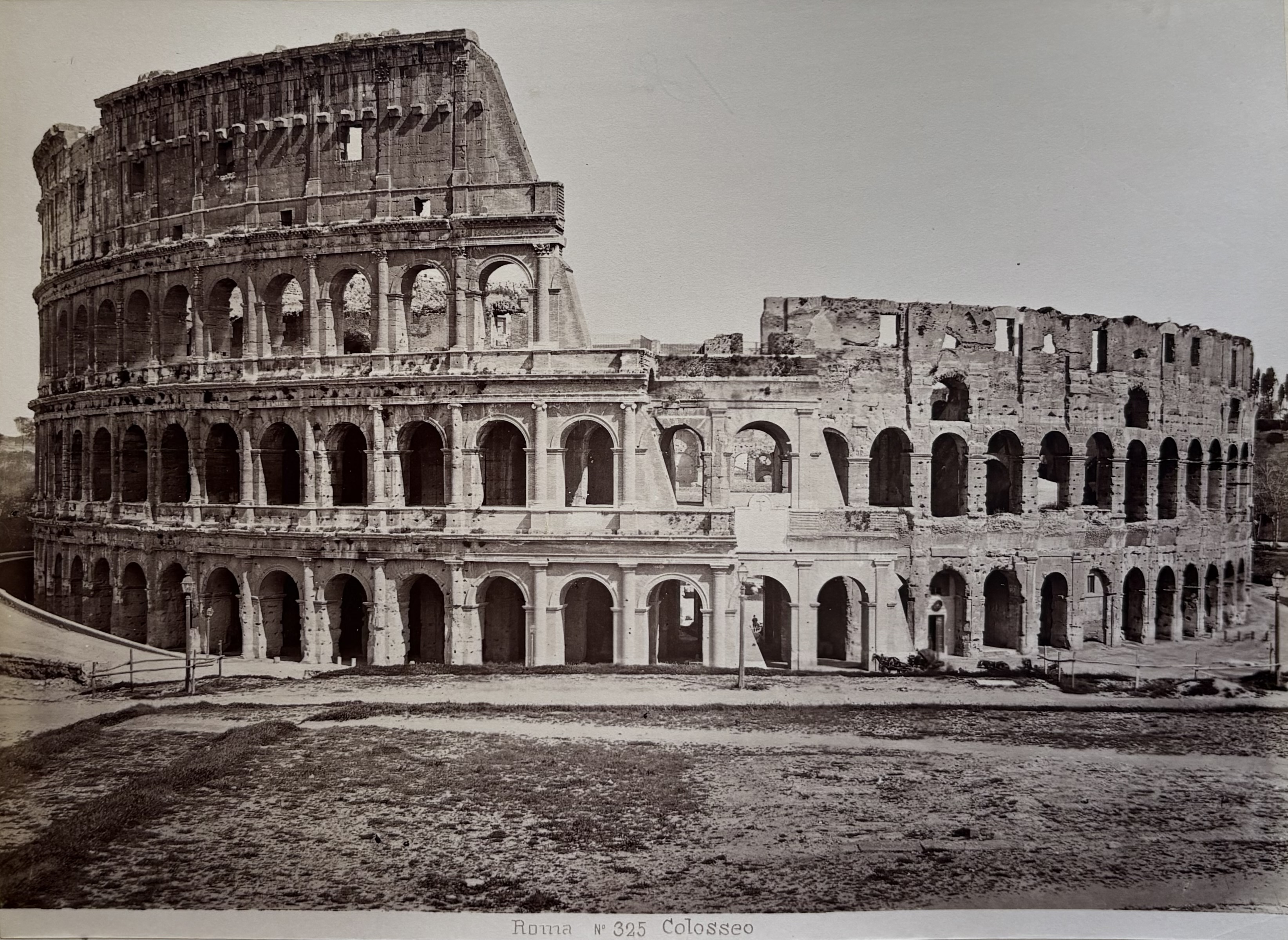 The images from Rome include the Coliseum, the Forum, the Pantheon, Castel Sant'Angelo, the Piazza del Popolo, Constantine’s Arch, among others, while the images of paintings and frescoes are mostly from the collections in the Vatican, including the ceiling of the Sistine Chapel. From Pompei the views include the Temple of Jupiter and an exceptional image of a plaster cast of a young woman caught in the eruption of Vesuvius in 79 C.E. The latter photo’s caption identifies it as being from the 1878 excavations, allowing us to date the album to c. 1880.