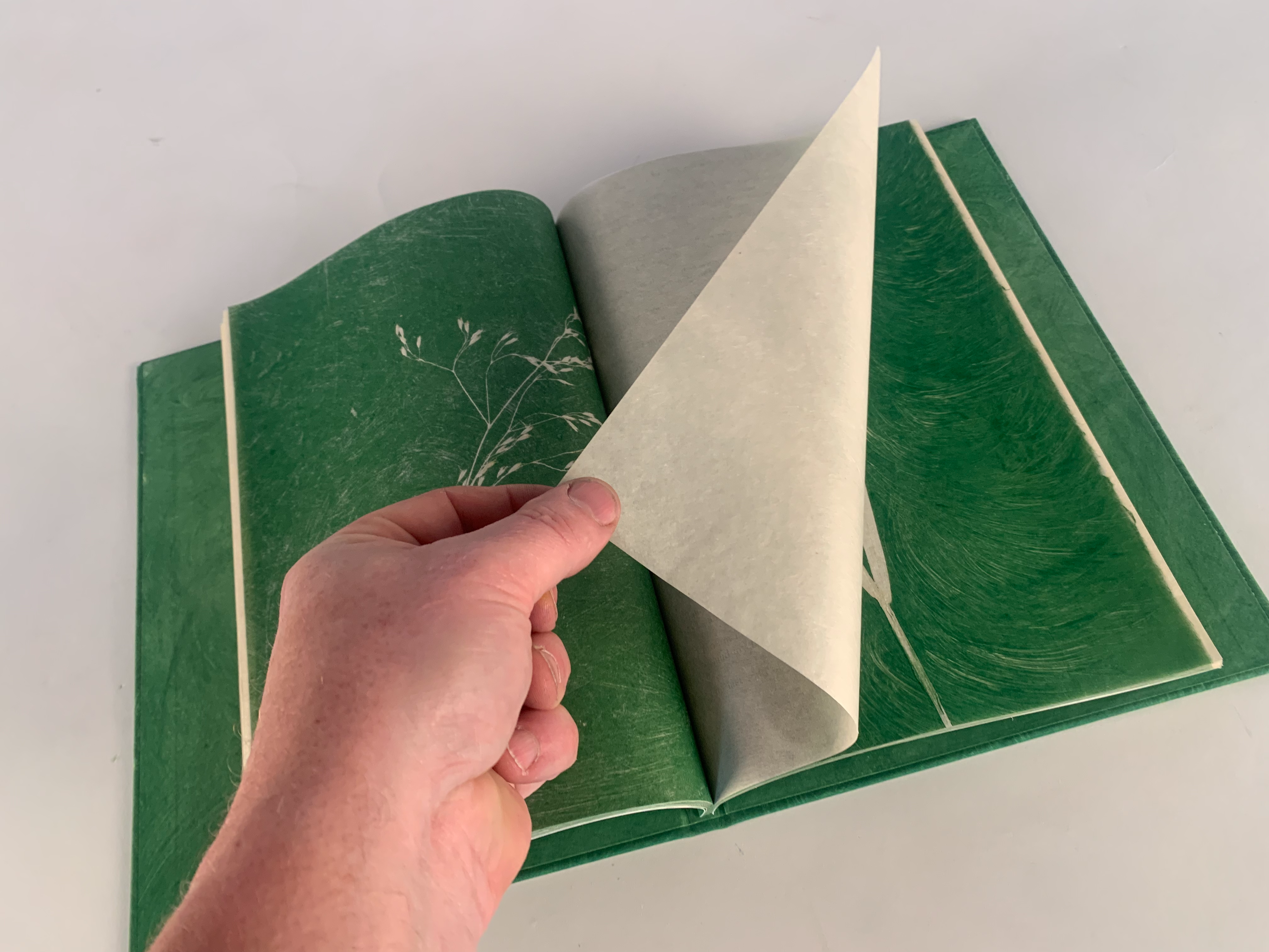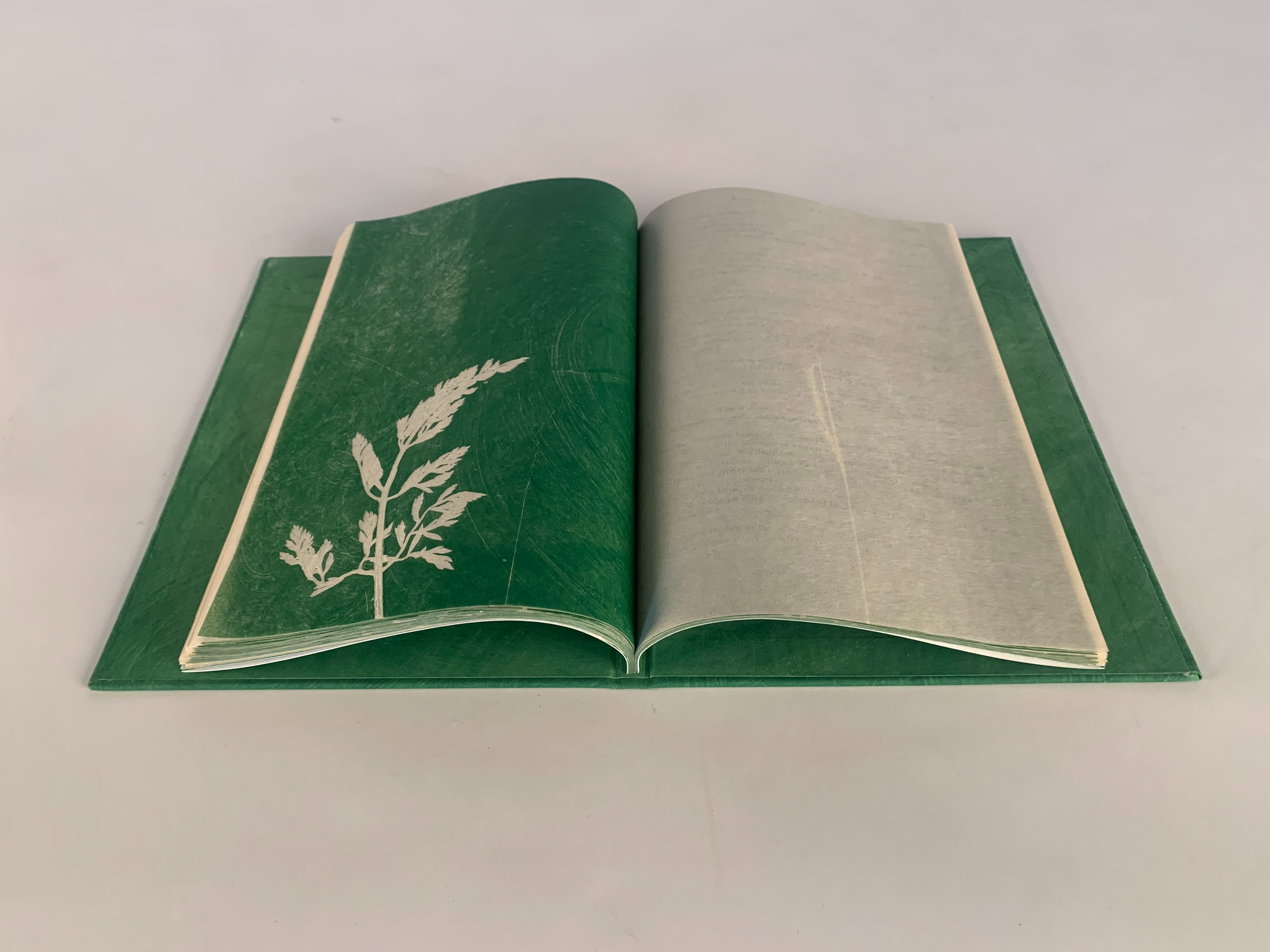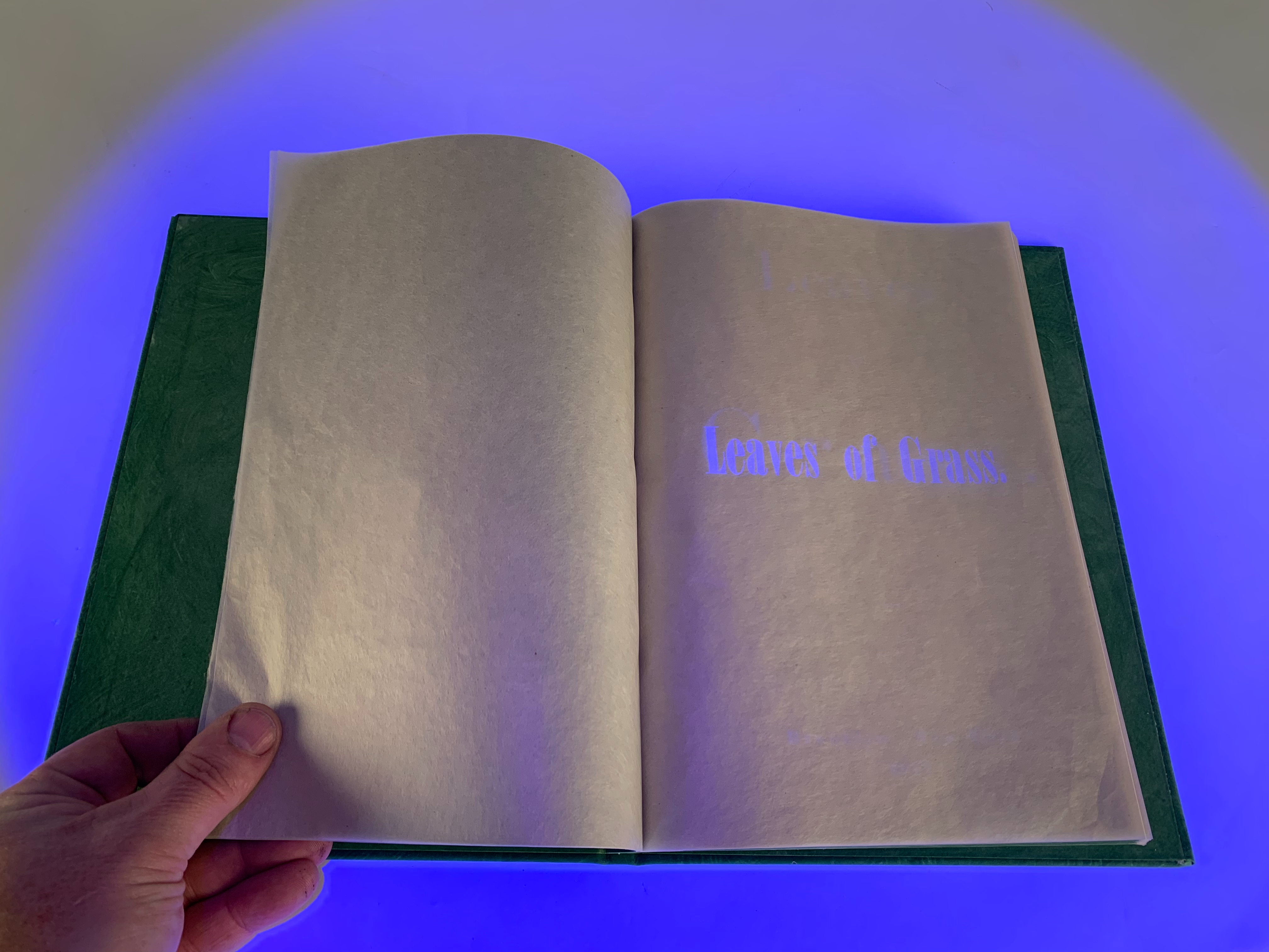 Colophon: A silent leaf. This edition of Leaves of Grass. has been printed off the 4th of March 2026. 50 numbered and signed copies by Didier Mutel are printed on gampi paper with photoluminescent ink only readable if revealed by UV light. The binding and the 42 monotypes are by Didier Mutel.