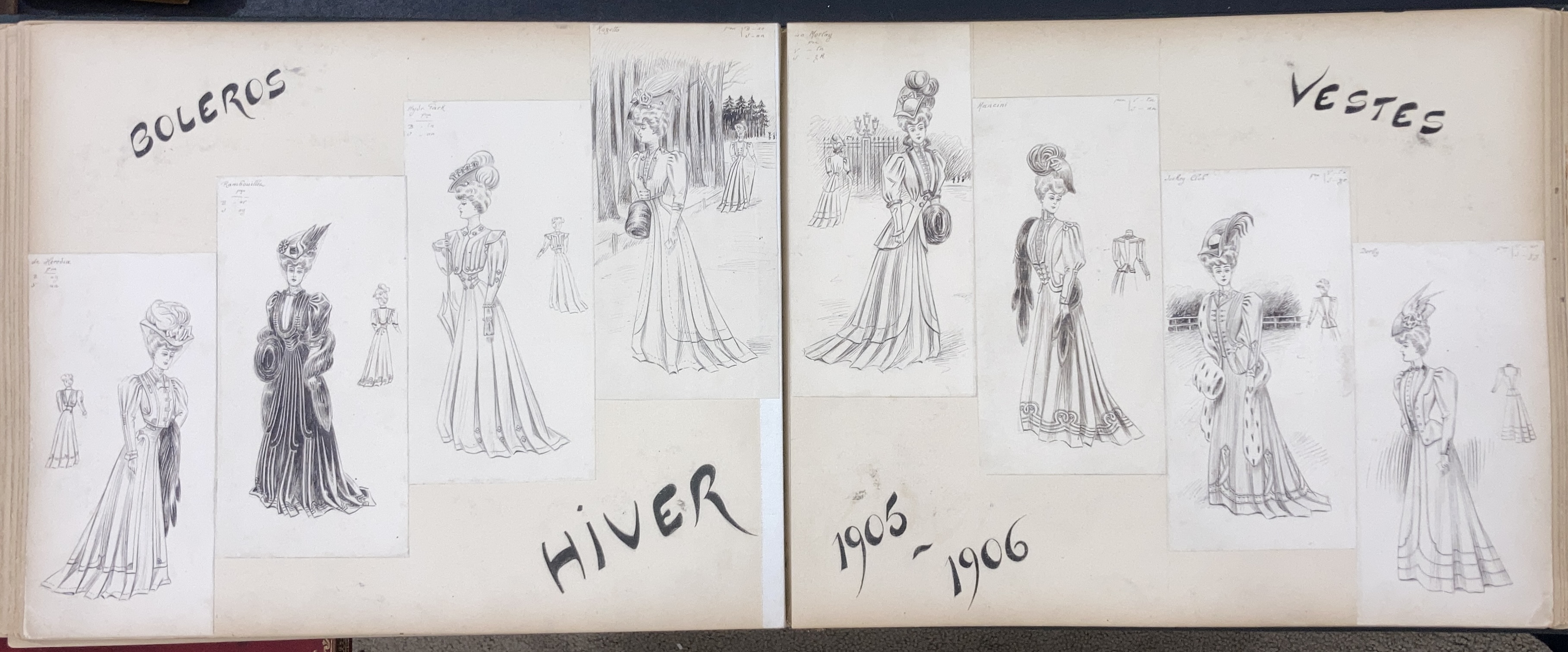 [FASHION - DRAWINGS - PHOTOGRAPHS]. Album de la maison Detrois, rue du Bac, comportant les saisons été 1904, hiver 1904-1905, été 1905 et hiver 1905-1906.