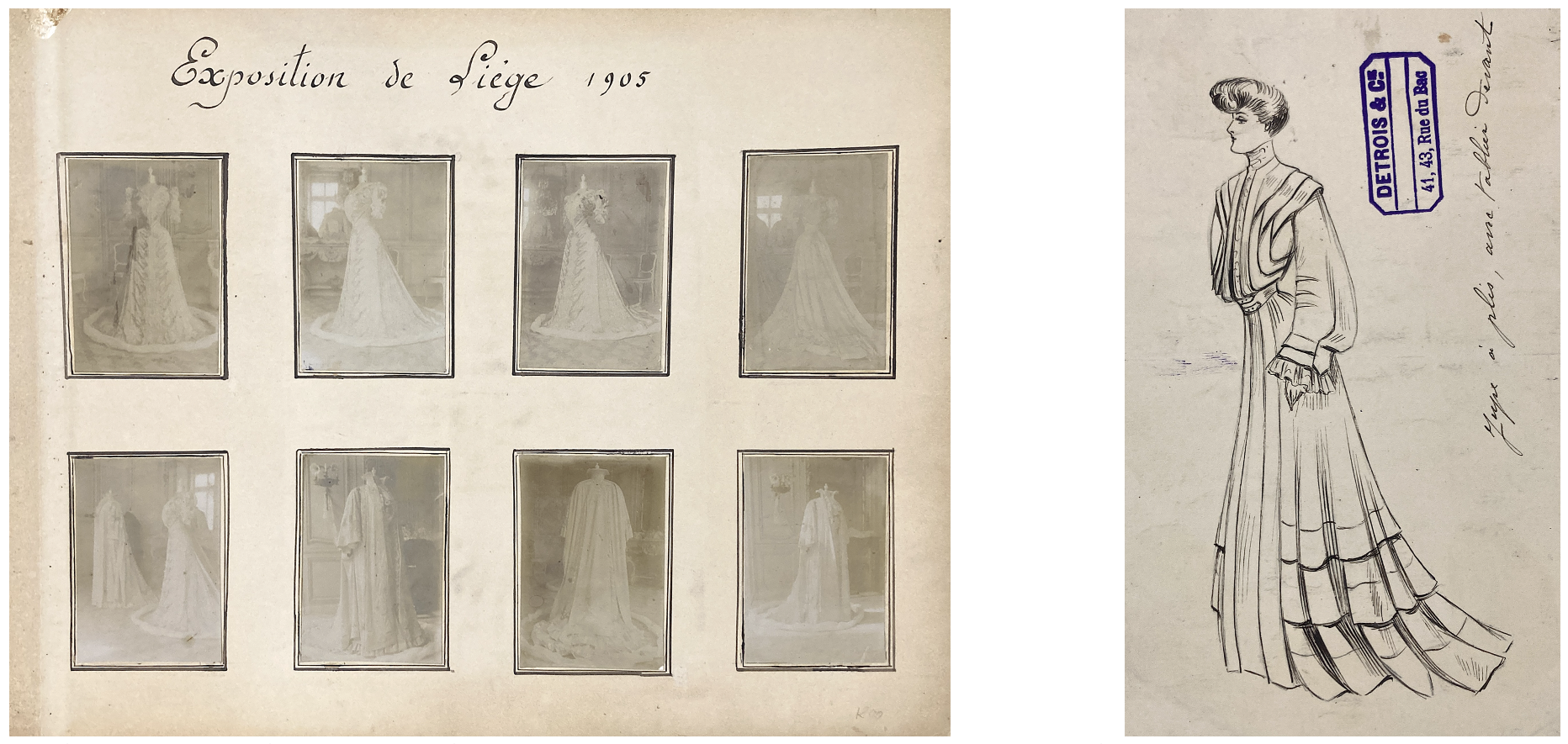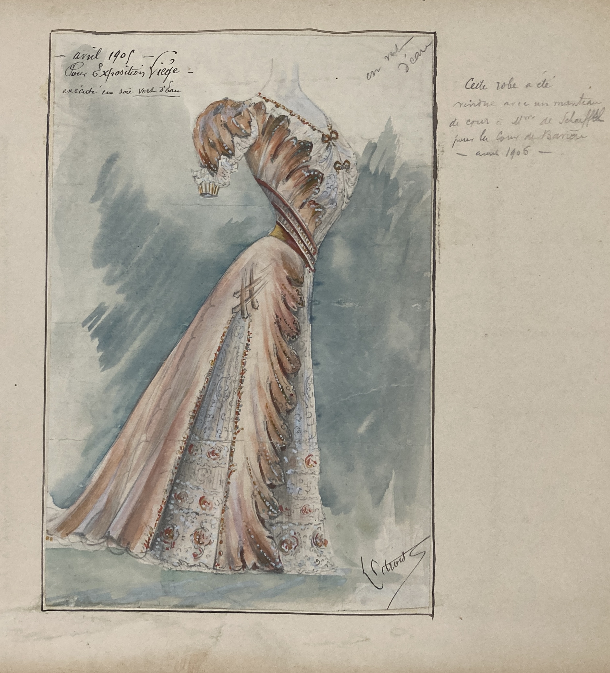 Original watercolor drawings : the caption reveals the dress was displayed at the 1905 Liège Exhibition and sold with a “manteau de cour” to Madame de Schaeffel, for the Court of Bavaria.