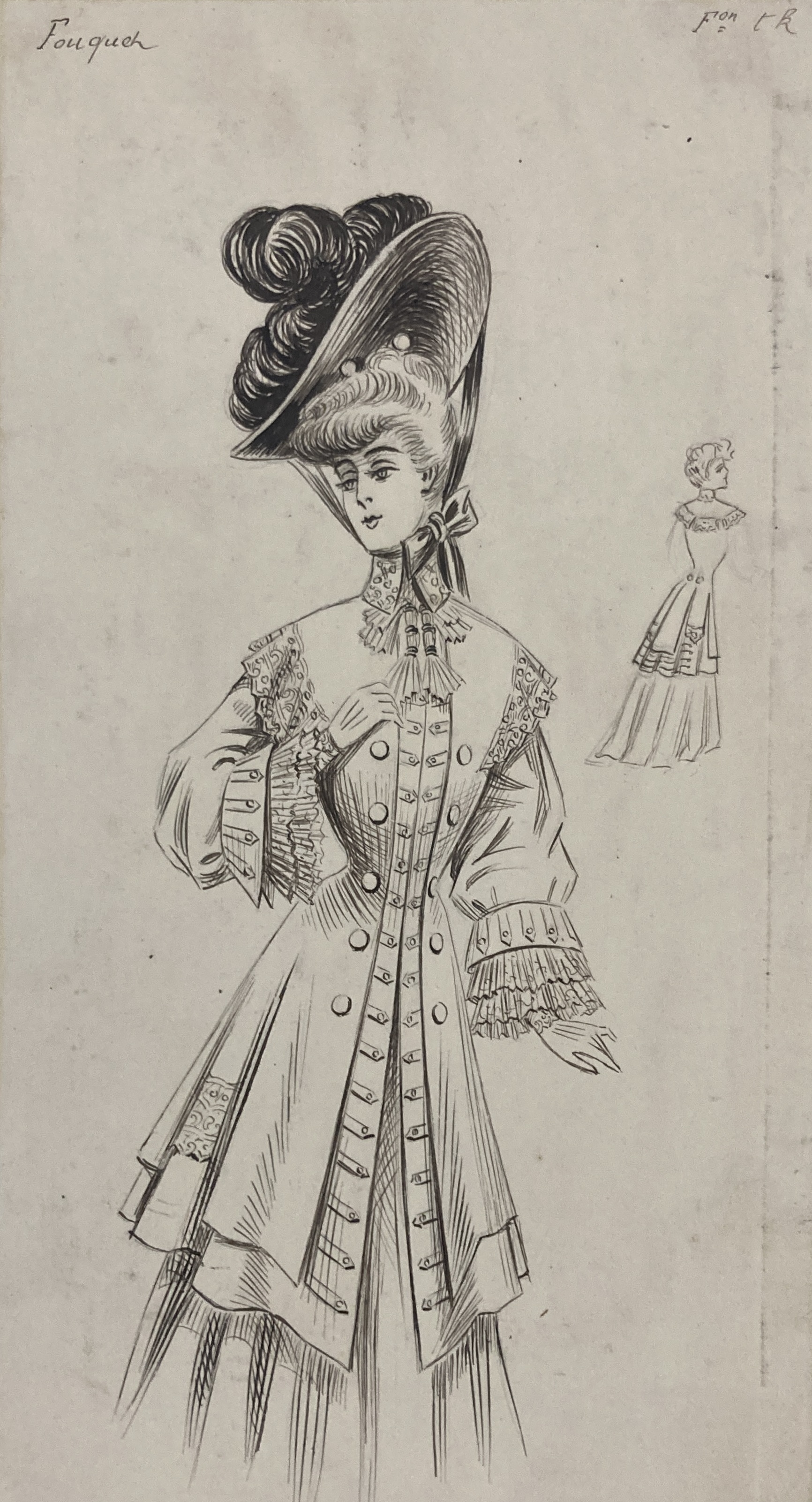 A remarkable collection of high-fashion dresses, some undoubtedly intended for promenades and appearance at court, drawn with great finesse. A panorama of Belle Époque women’s fashion.