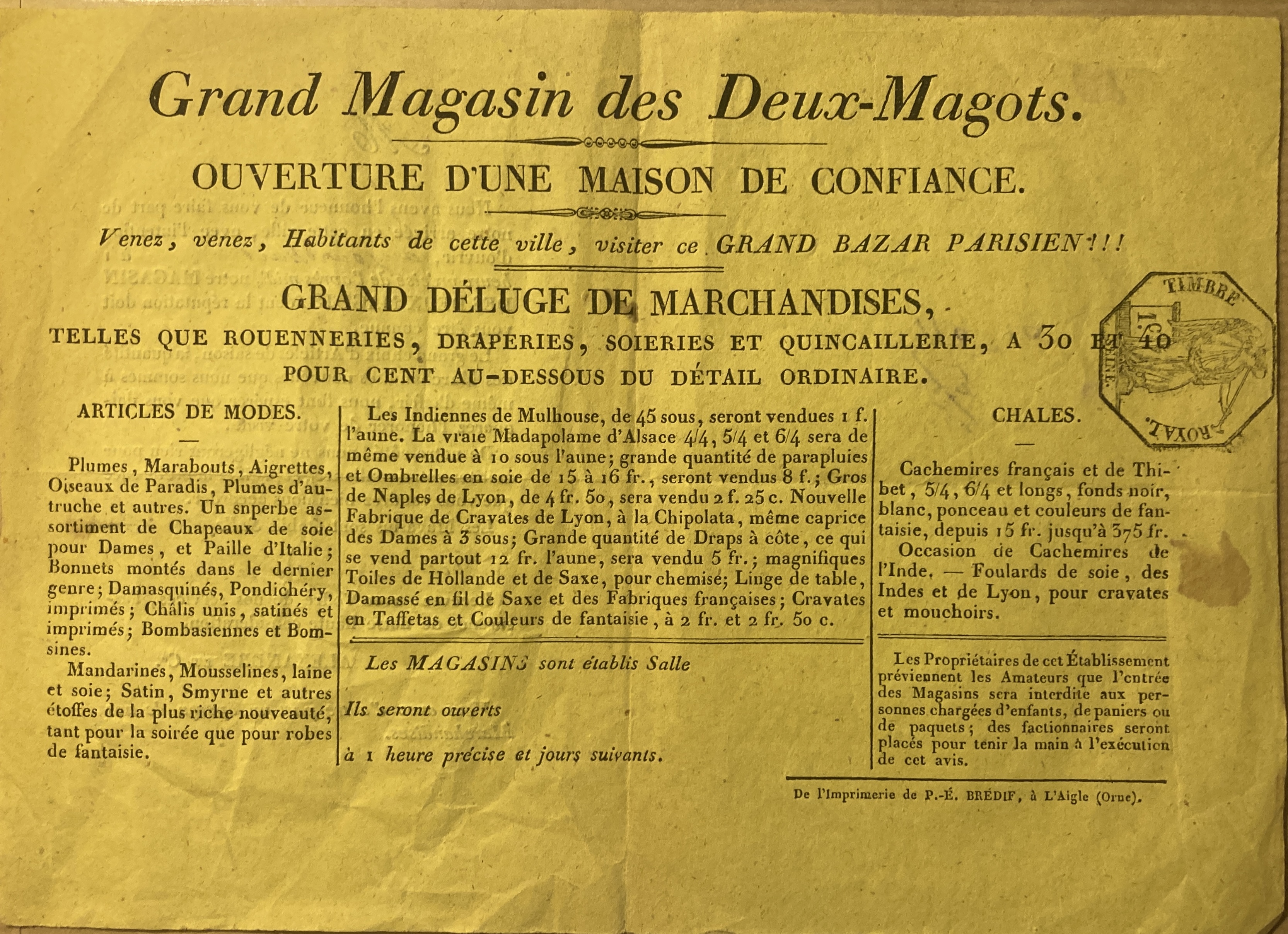 Publicity leaflet and invitation [155 x 215 mm.] printed recto and verso on yellow paper with Royal tax stamp. This leaflet invites residents of an unnamed city to visit what was certainly a traveling or “pop-up” shop of the Parisian department store Deux Magots. The recto describes the kinds of merchandise available, while the verso comprises the invitation and includes blanks for the date (“aujourd’hui [today]” in manuscript) and the location [“Boite près Notre Dame”(?)] of the “pop-up” display.