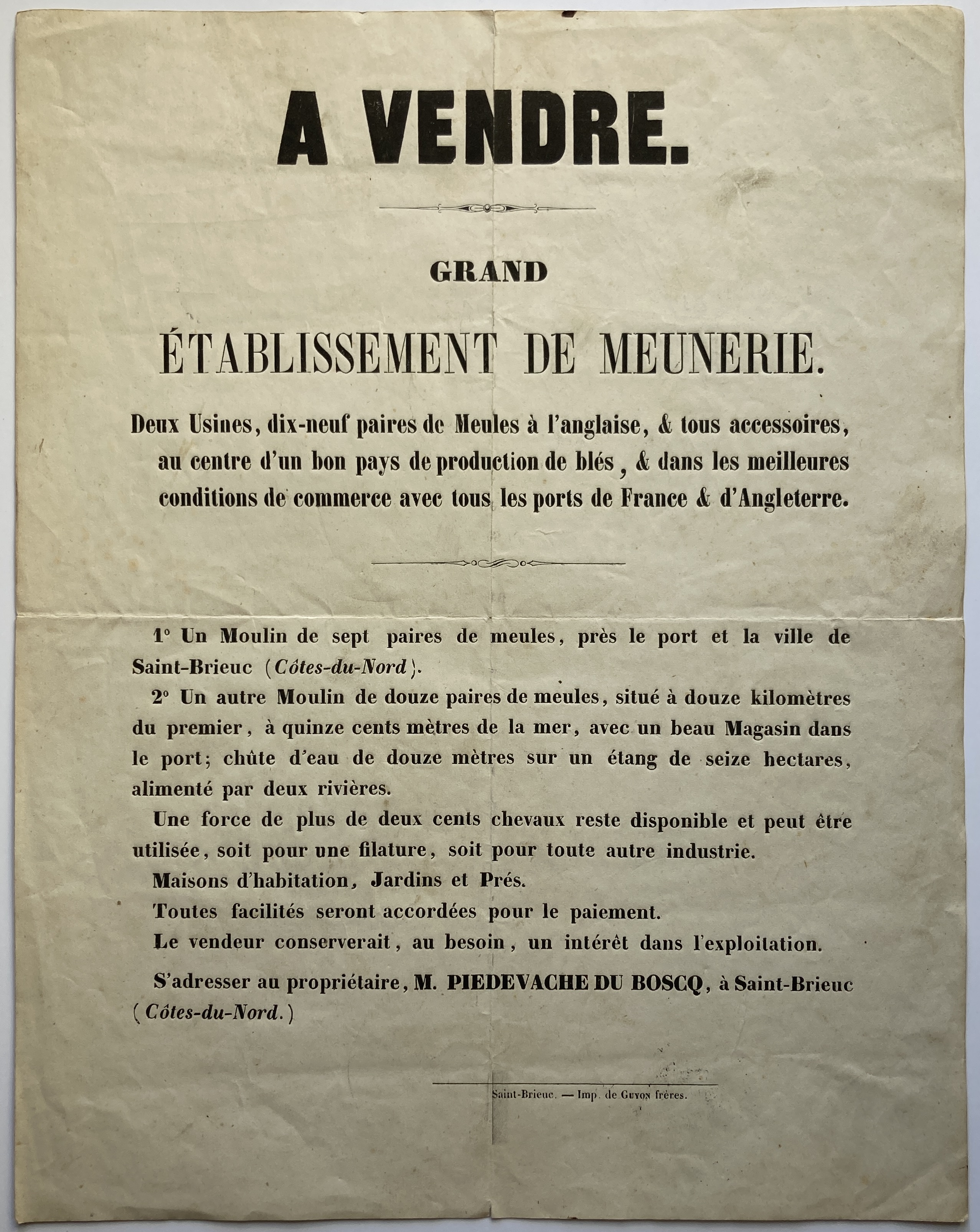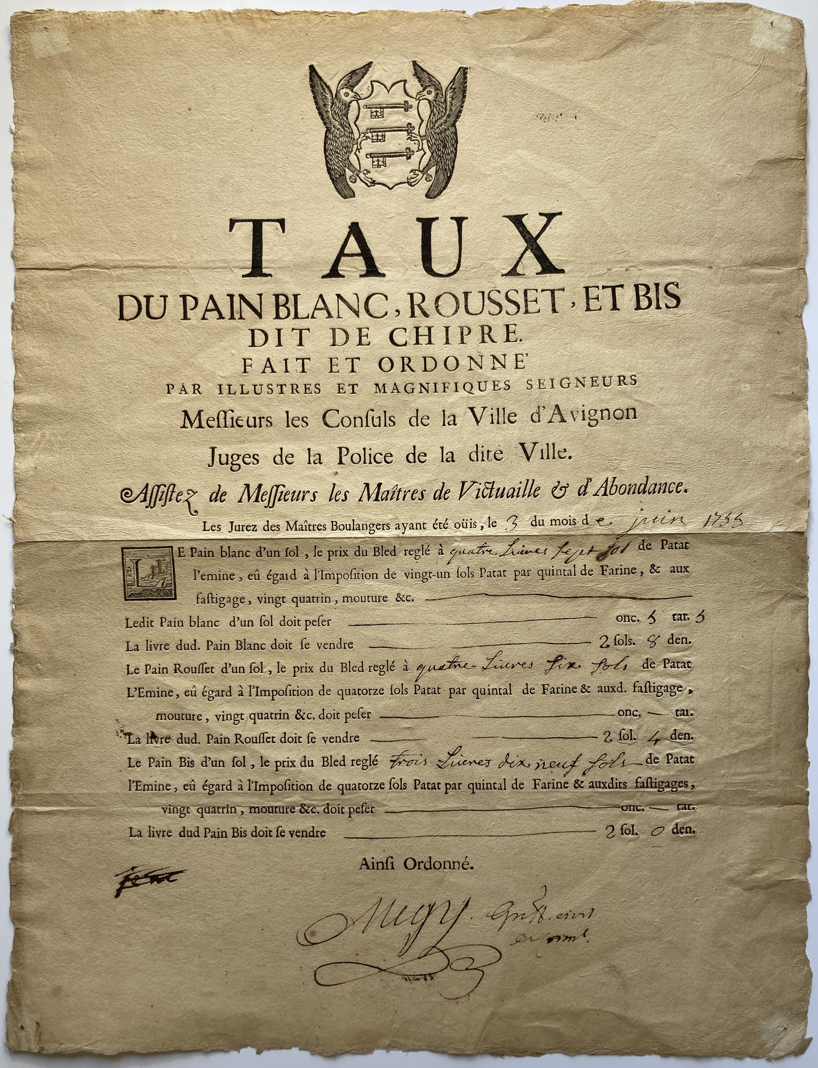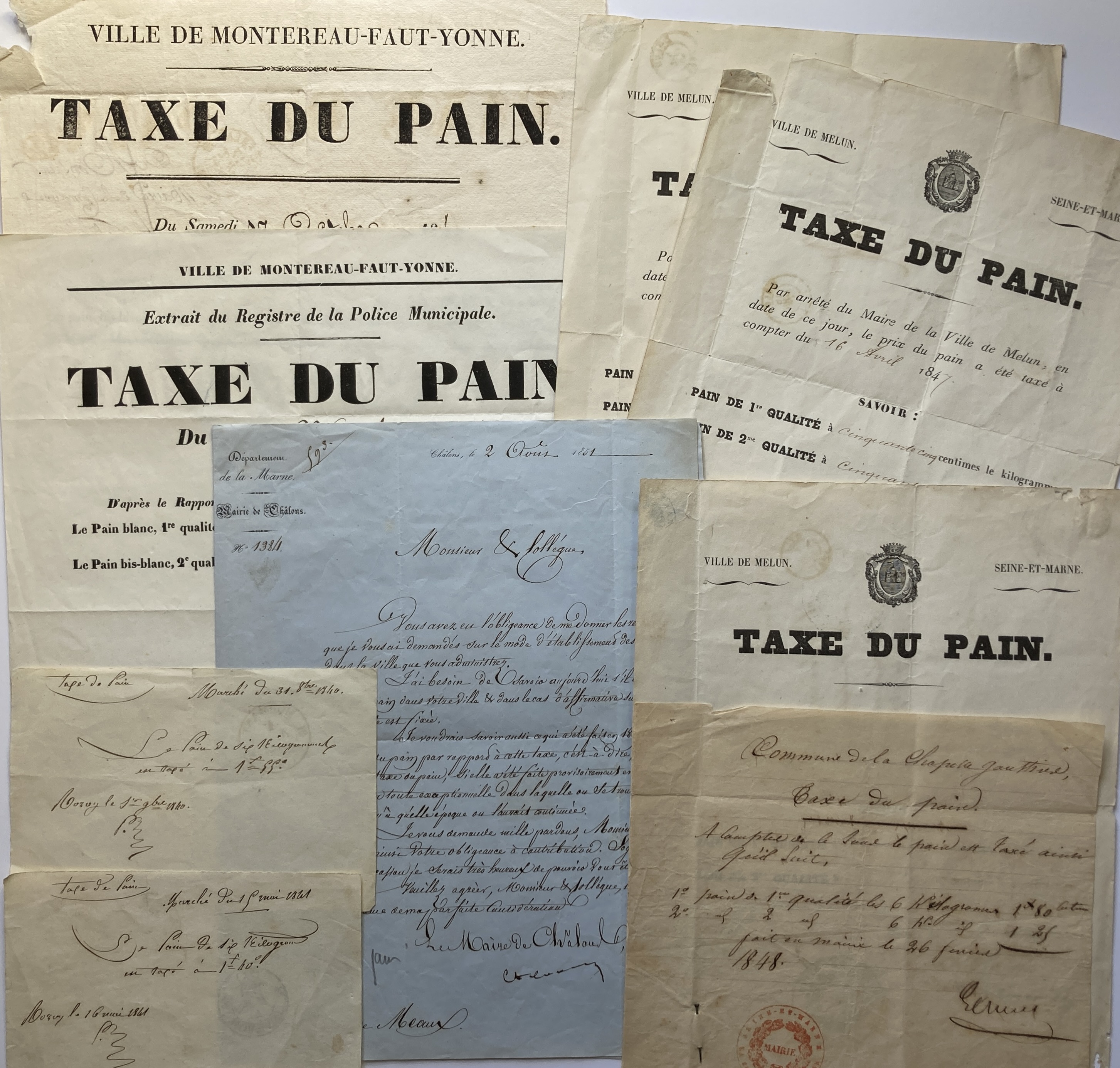 A selection of manuscript and printed items all related to the production, pricing, and taxation of bread in France, including documents for home ovens, a patented breadmaking machine, a real estate flyer for an extensive flour mill, etc.