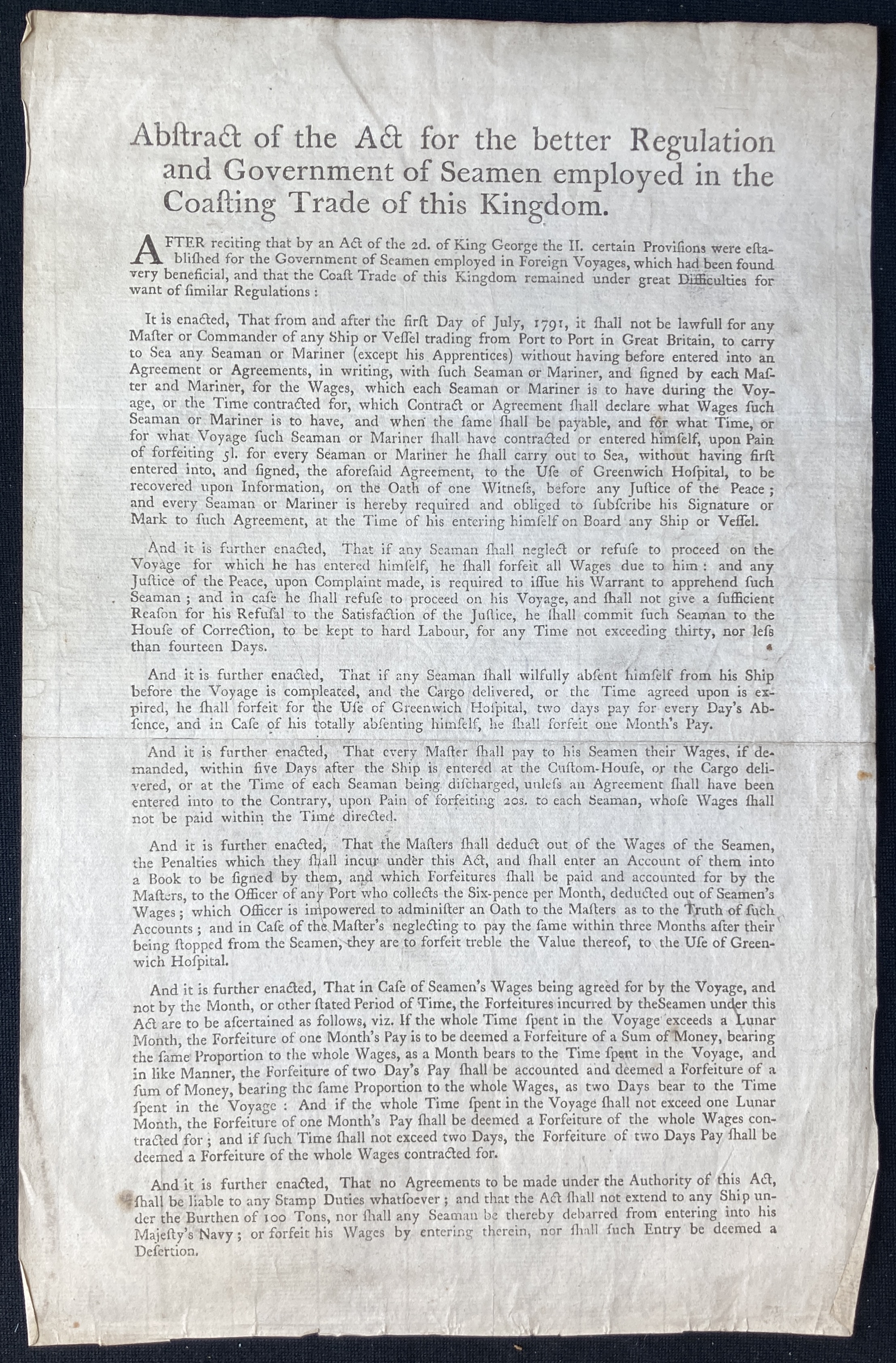 2). Abstract of the act for the better regulation and government of seamen employed in the Coasting Trade of this Kingdom. [London, 1791]