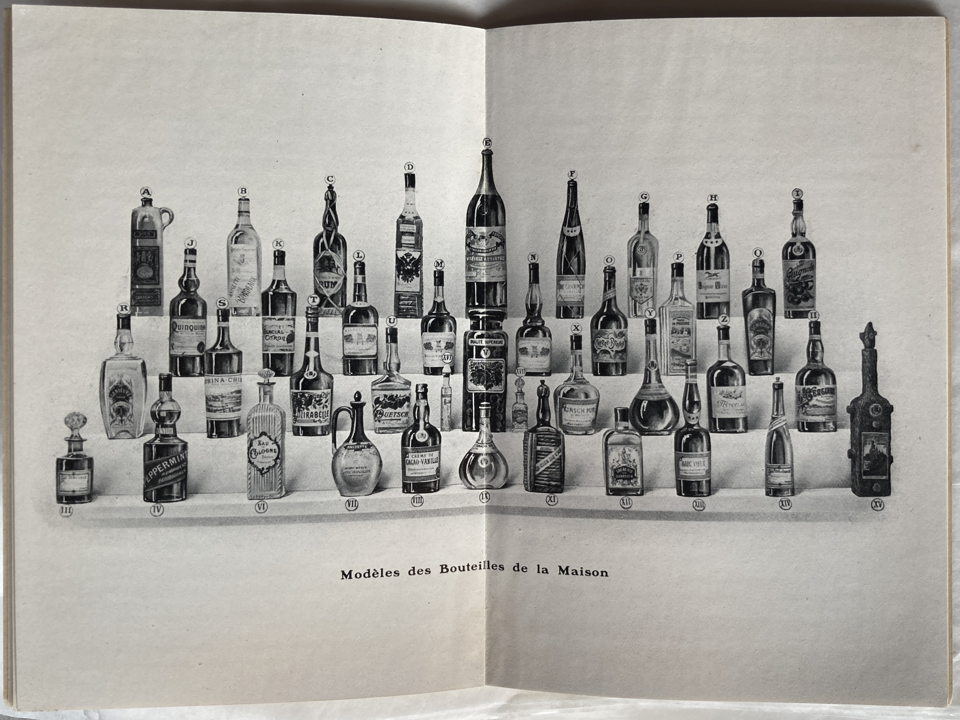 (16 x 10.7 cm). 20 pp. One double page plate. Publisher’s original stiff wrappers, printed in color and bound with yellow thread. “Spécialité de vins de Quinquina - liqueurs supérieures - Kirsh et Gentiane - Importation directe de Rhum.” Beautiful catalogue illustrated in black and color. Near fine copy.