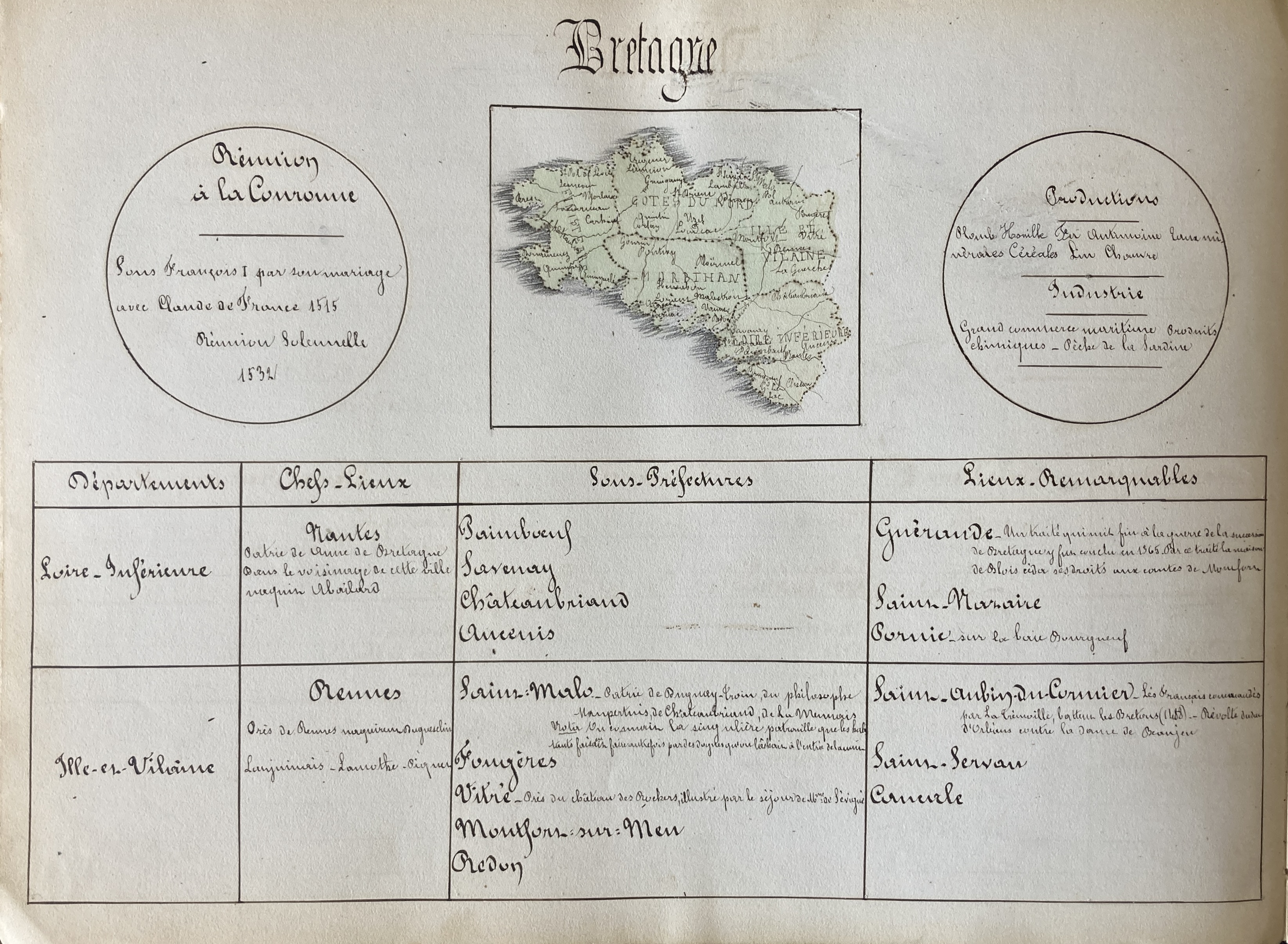 The volume is typical of French pedagogical practices in which students create formally designed book objects on the topic being studied, in this case with carefully hand-colored maps. The present volume offers a detailed account of 37 different regions of France, (Flanders, Alsace, Lorraine, Ile de France, Brittany, Normandy, Burgundy, etc.), each with a colored map, and 5 hand-colored maps for Belgium, the British Iles, Holland, Denmark, and Russia, with blanks leaves no doubt intended for maps of Switzerland and Sweden.