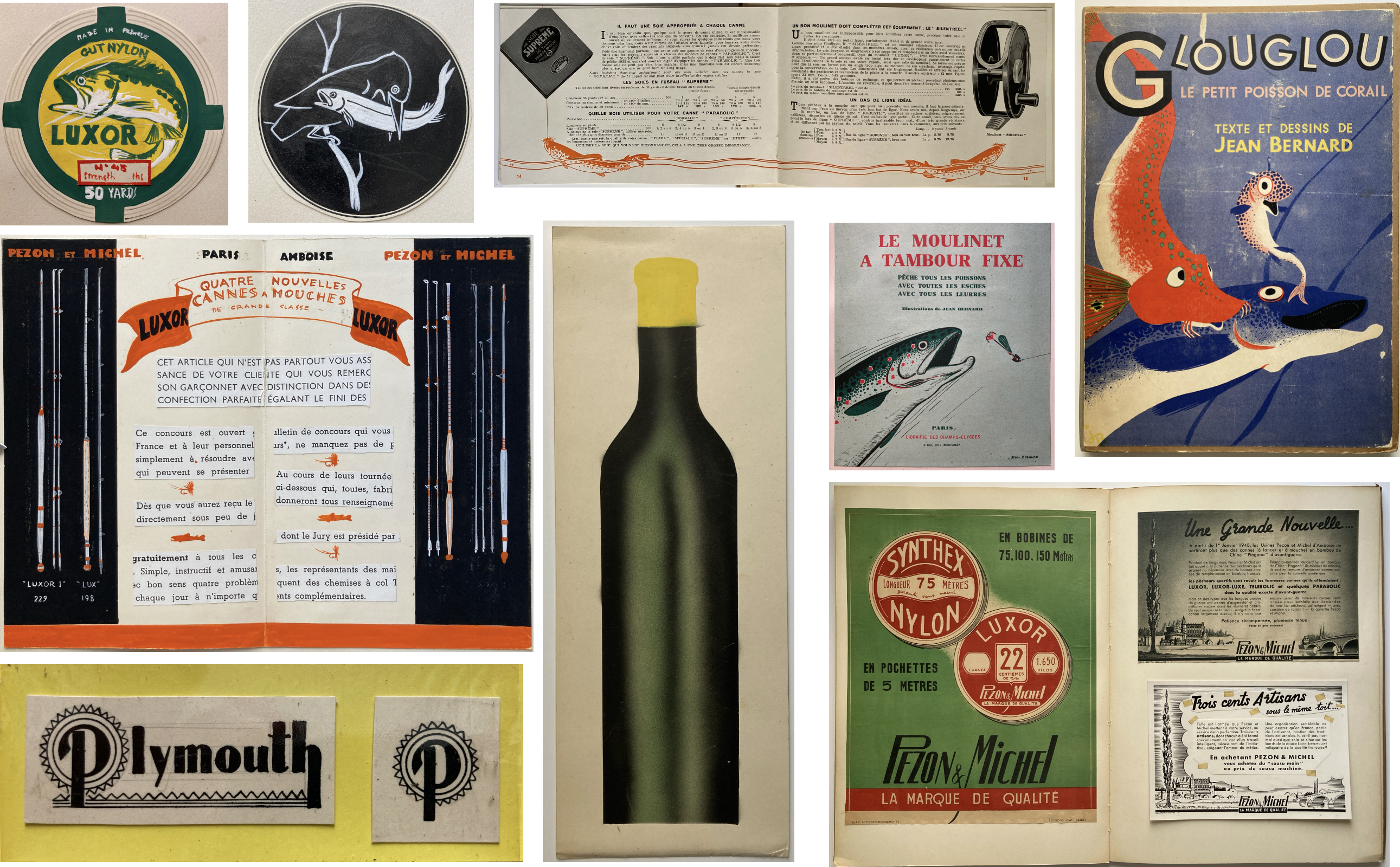 Stetten-Bernard, a Frenchman, was mobilized in 1939, taken prison in 1940, but then escaped and made his way to Lyon where he began working for the French Resistance as a document forger under the code name “Articles de Pêche [Fishing Gear].” Stetten-Bernard’s work is laid-out in a carefully manner, with ephemera and original art work pasted in. There are advertisements and artwork for fishing rods and reels, lures, tackle boxes, fishing line, fish nets, logos for manufacturers, and book jackets. These pieces include 16-page catalogue for Pezon & Michel's bamboo fly rod, the Parabolic, an 8-page pamphlet for their Luxor-Supréme reel, and two book jackets: Maurice Constantin-Weyer's Le Moulinet a Tambour Fixe (1937) and Nadaud & Driancourt's De La Pêche au Coup au Lancer Léger (1947). Additionally, there is a hand-painted color logo for Luxor fishing line, a hand-painted brochure with pasted-in text for Pezon & Michel's Luxor fly rods, ink-drawn logos for “Plymouth”, and other paste-ups, and ink originals.