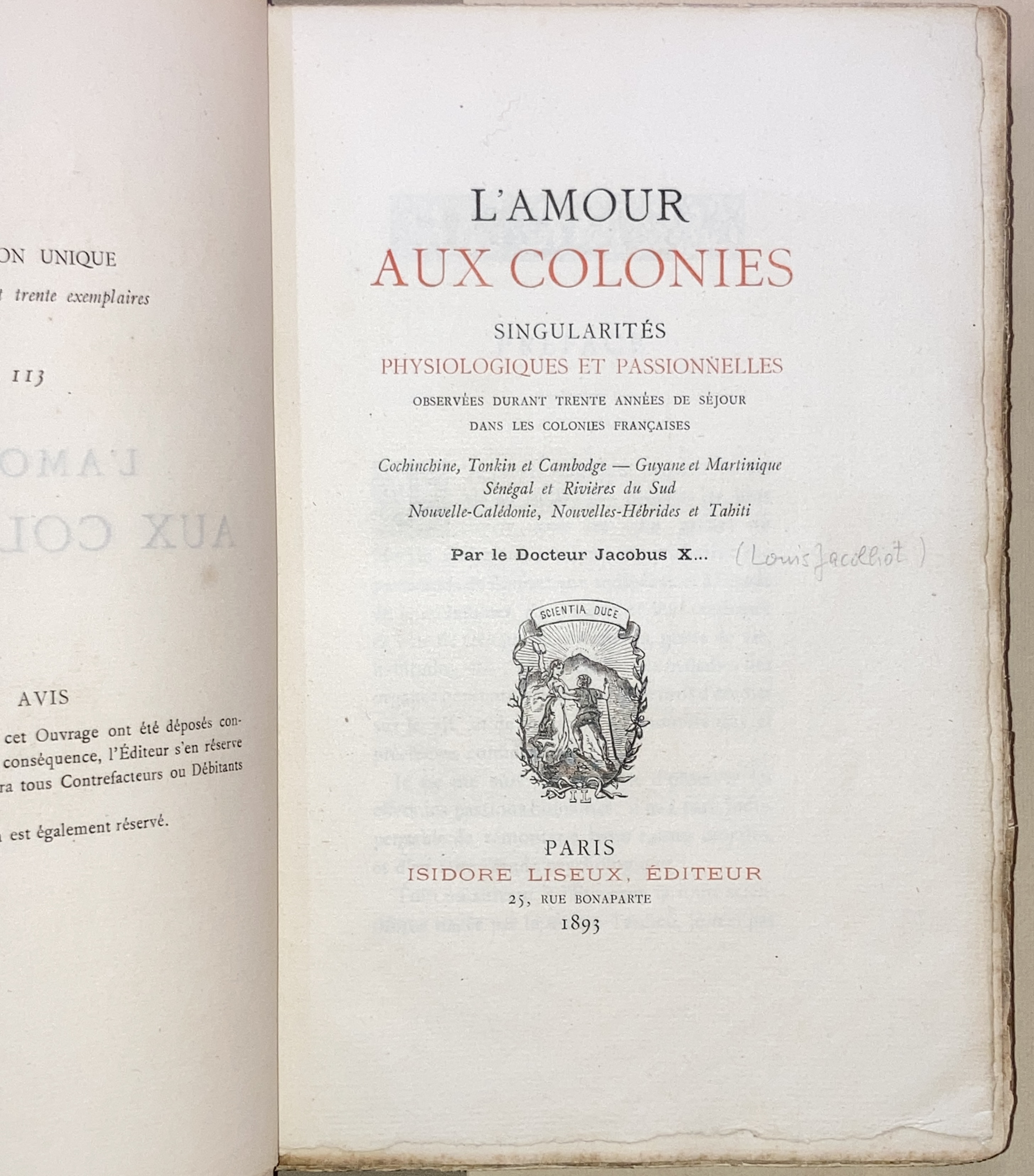 [CURIOSA] Dr. Jacobus X. L'AMOUR AUX COLONIES. Singularités physiologiques et passionnelles observées durant trente années de séjour dans les colonies françaises. Cochinchine, Tonkin et Cambodge. Guyane et Martinique, Sénégal et Rivières du Sud, Nouvelle-Calédonie, Nouvelles- Hébrides et Tahiti. Par le docteur Jacobus X ....