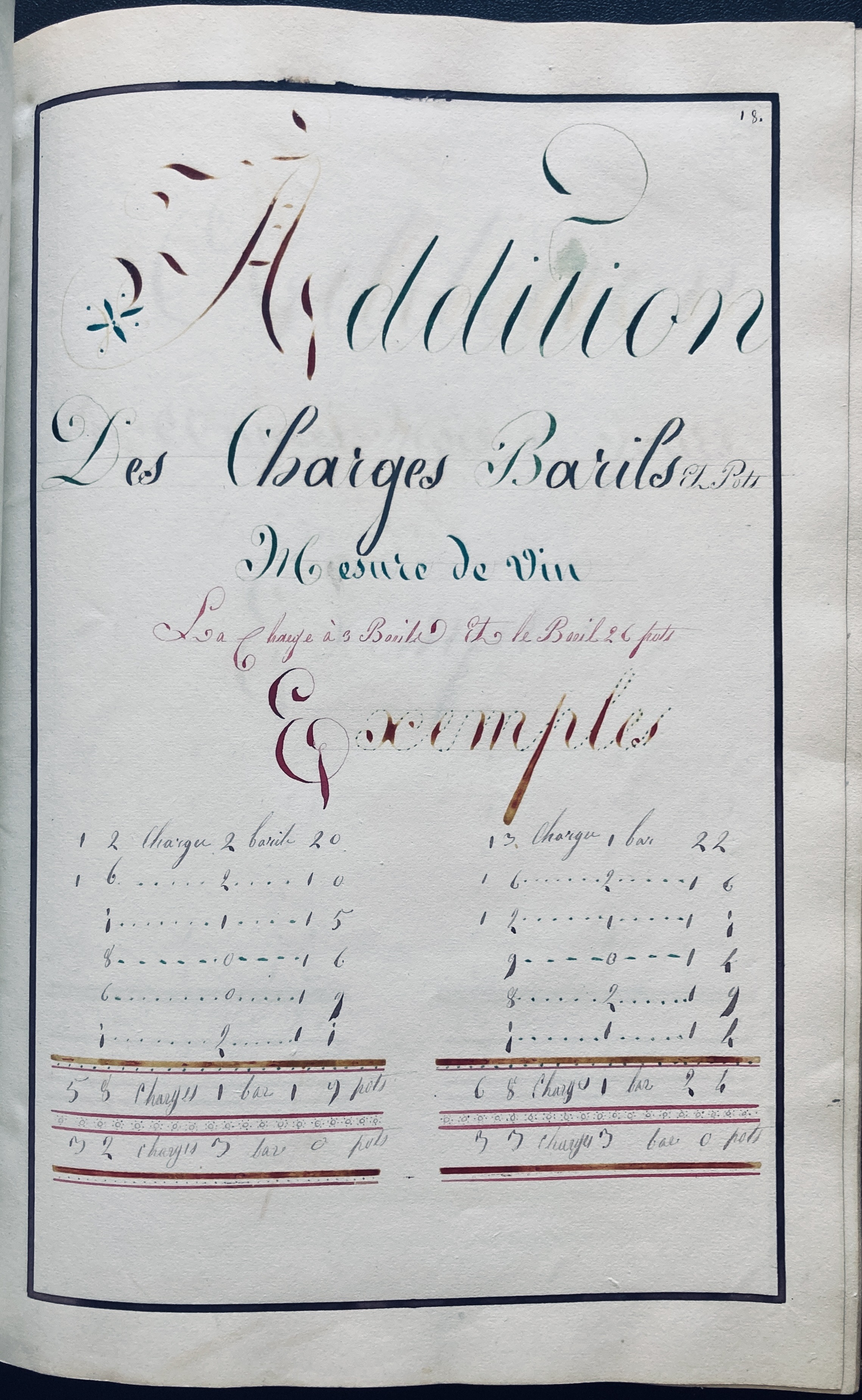 The material aspect of this unusually luxurious textbook—gilt stamped morocco binding and liberal use of paper (the exercises appear on the rectos only), tells us that Augustine must have been from a well-educated and well-to-do family. The carefully handwritten creation of this exercise book also demonstrates her competency in mathematics as well as penmanship. It is further noteworthy that a young woman's education in the early 19th century would include exercises in commercial business as seen here. The work opens with a pedagogical exercise on the principles of arithmetic in a Question and Answer fashion: the student has responded to a series of 32 questions, beginning with the question: “Qu’est ce que l’arithmétique [what is arithmetic]?” The table of contents lists over 60 essential exercises in all.