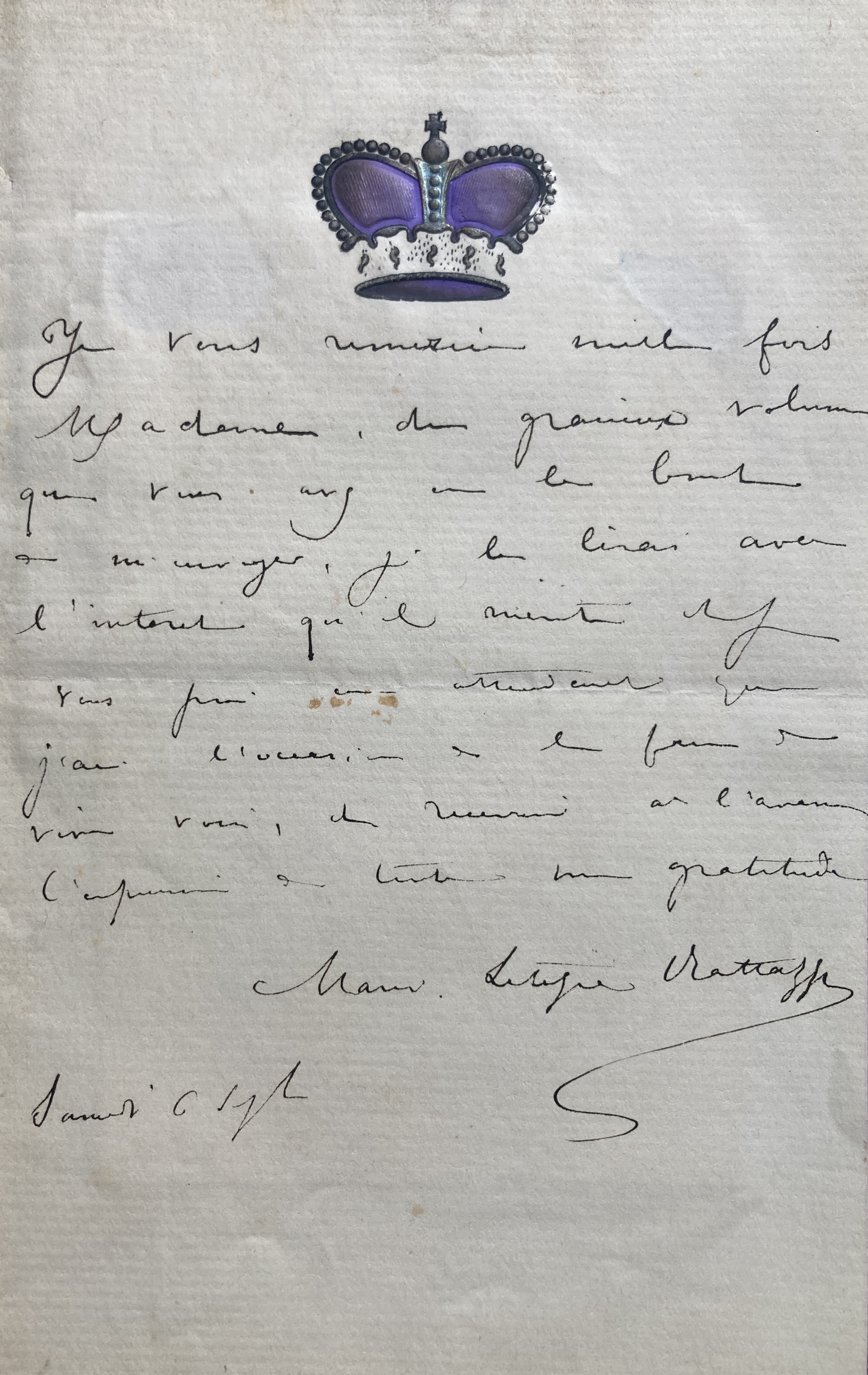 An autograph letter signed (1 p.) to Madame Marie Cellini, addressed to the Casino in Trouville, written on Rattazzi’s crowned stationery and envelop, to thank Cellini for sending her a book, “le gracieux volume” [likely Cellini’s Toute une vie, 1872] that “Je le lirai avec l'intérêt qu'il mérite et je vous prie en attendant que j'aie l'occasion de le faire de vive voix, de recevoir [...] l'expression de toute ma gratitude [I will read it with the interest it deserves and I beg you, until I have the opportunity to do so in person, to receive [...] the expression of all my gratitude].” Pasted to the verso of the letter is an engraved portrait of Rattazzi, printed at the Atelier Salmon, Paris. The carte-de-visite is by Ferdinand J. Mulnier.