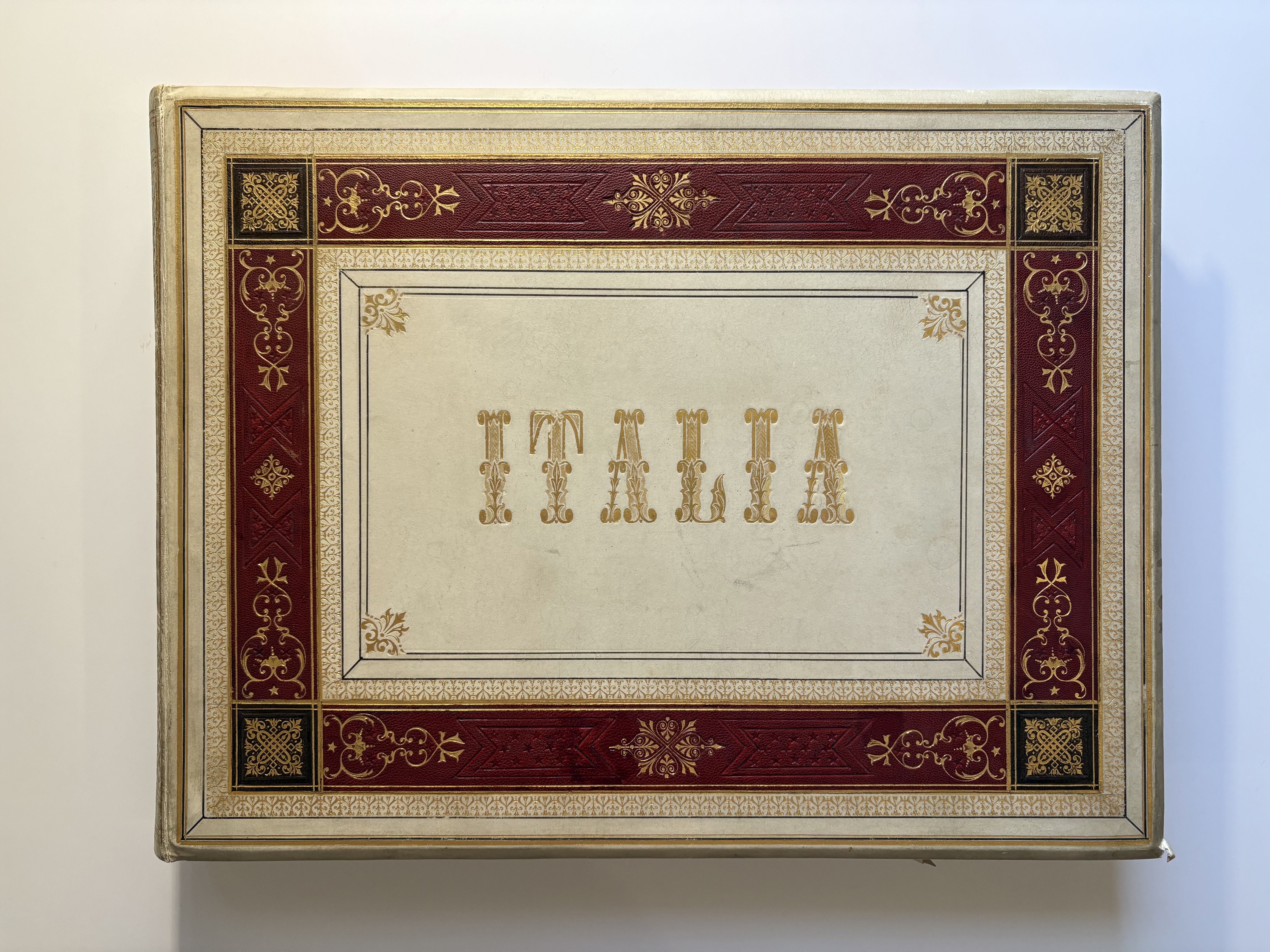 (26 x 34 cm). 50 leaves of thick card stock, with two photographs (18 x 24.5 cm for the photos) per leaf, 100 images in all. Beautifully bound in contemporary gilt stamped parchment and red sheepskin, with gilt title on the front board, “Italia” and (likely) the previous owner’s name, “Howell” on the back board. The leaves are bound on cloth tabs allowing the album to open and the pages to turn easily, many of the original barrier sheets are present.