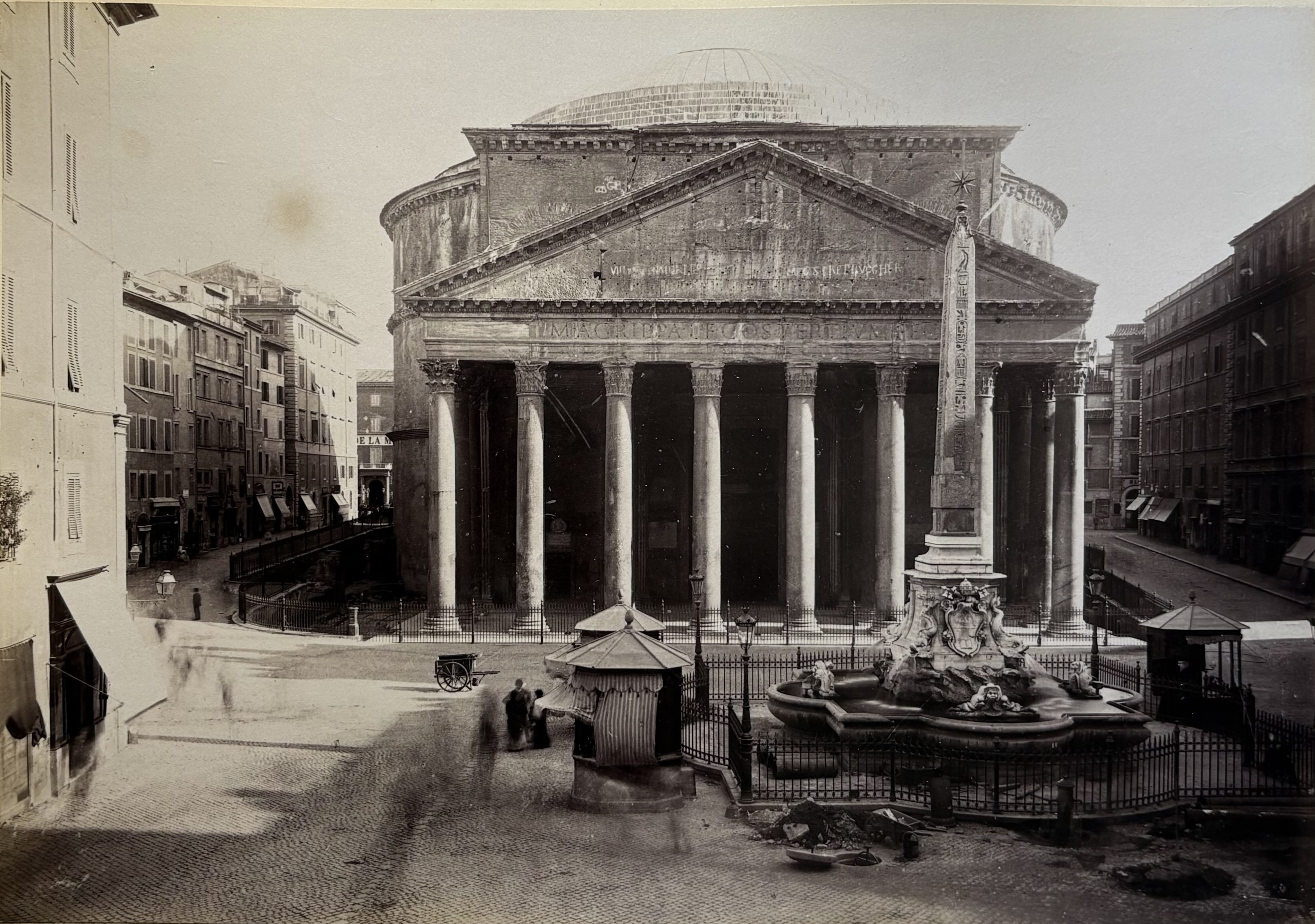The images from Rome include the Coliseum, the Forum, the Pantheon, Castel Sant'Angelo, the Piazza del Popolo, Constantine’s Arch, among others, while the images of paintings and frescoes are mostly from the collections in the Vatican, including the ceiling of the Sistine Chapel. From Pompei the views include the Temple of Jupiter and an exceptional image of a plaster cast of a young woman caught in the eruption of Vesuvius in 79 C.E. The latter photo’s caption identifies it as being from the 1878 excavations, allowing us to date the album to c. 1880.