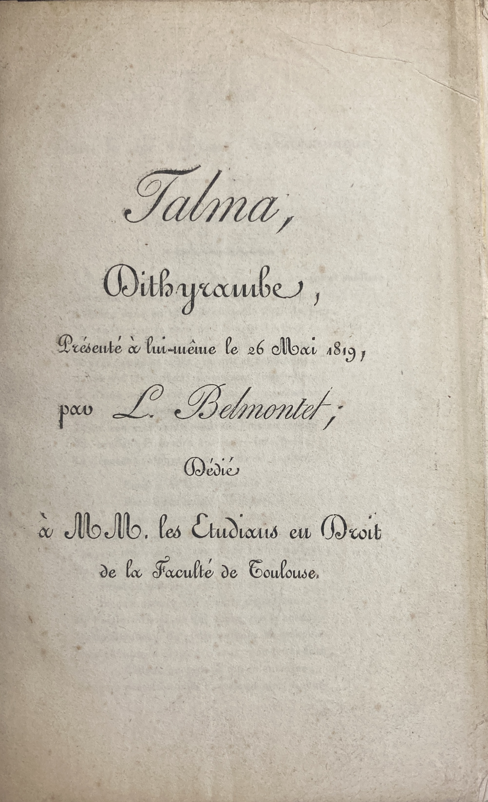 II. BELMONTET (Louis): Talma, dithyrambe, présenté à lui-même le 26 mai 1819, dédié à MM. les étudians en droit de la Faculté de Toulouse. Toulouse, F. Vieusseux, s.d. [1819], 8 pp.