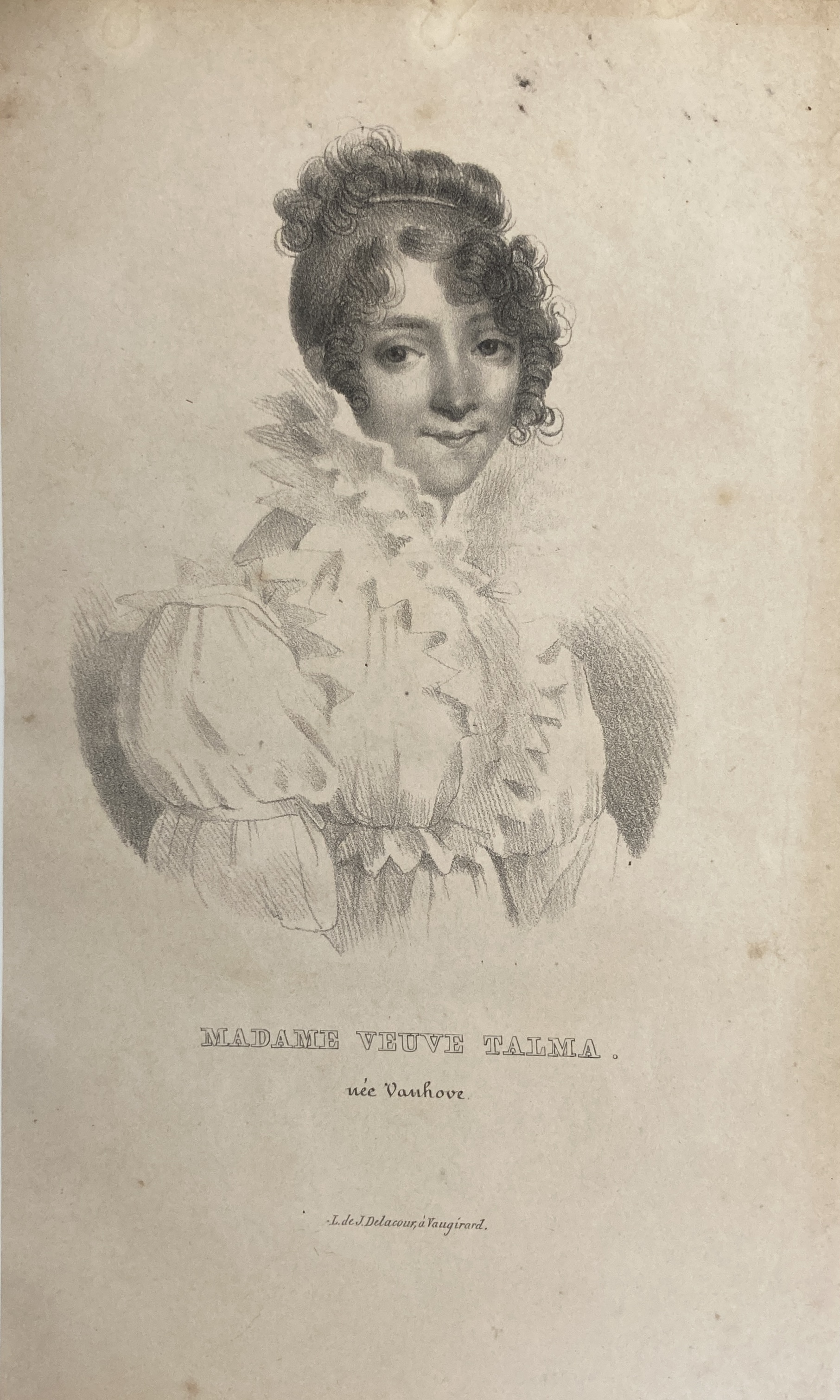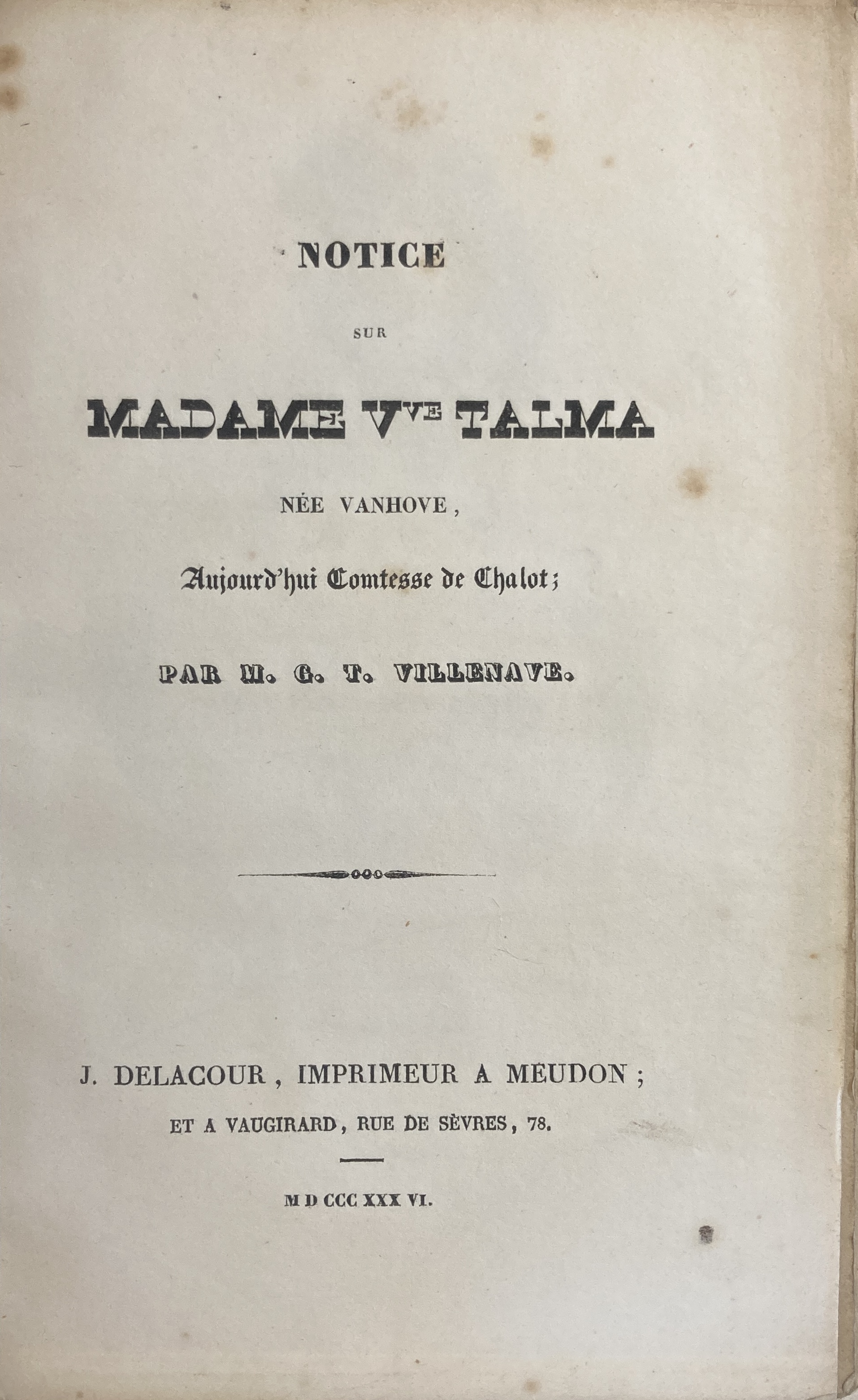 IV. VILLENAVE (Mathieu-Guillaume-Thérèse): Notice sur Madame Vve Talma née Vanhove, aujourd'hui comtesse de Chalot. Meudon et Vaugirard, J. Delacour, 1836. Title page, xxviij pp., plus a lithograph frontispiece portrait of Mme Caroline Talma.