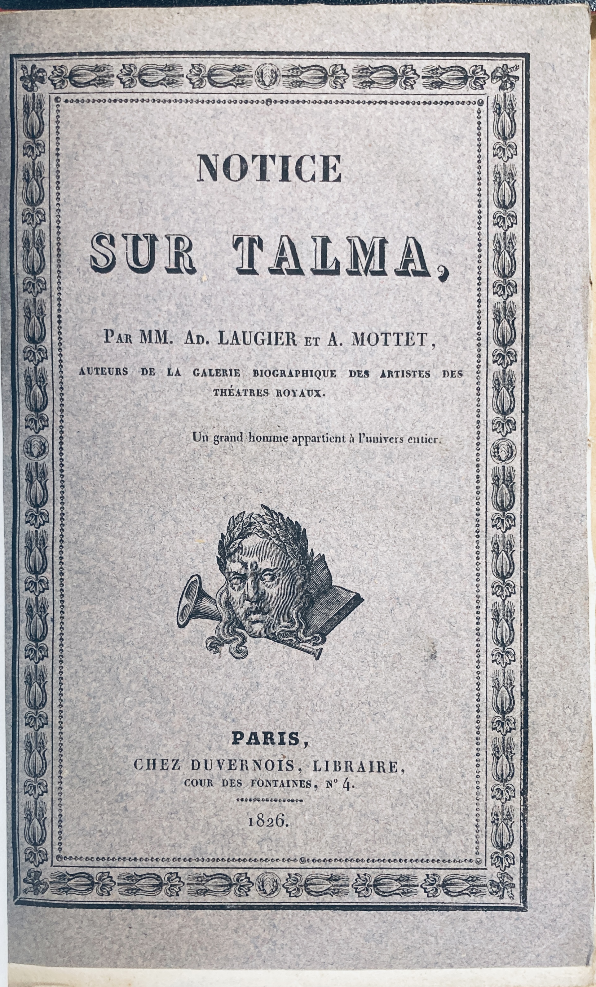 VII. LAUGIER (Adolphe) et MOTTET (Ambroise): Notice sur Talma. Paris, Duvernois, 1826. [2], ii, 30 pp. With the original printed wrappers preserved. First edition.