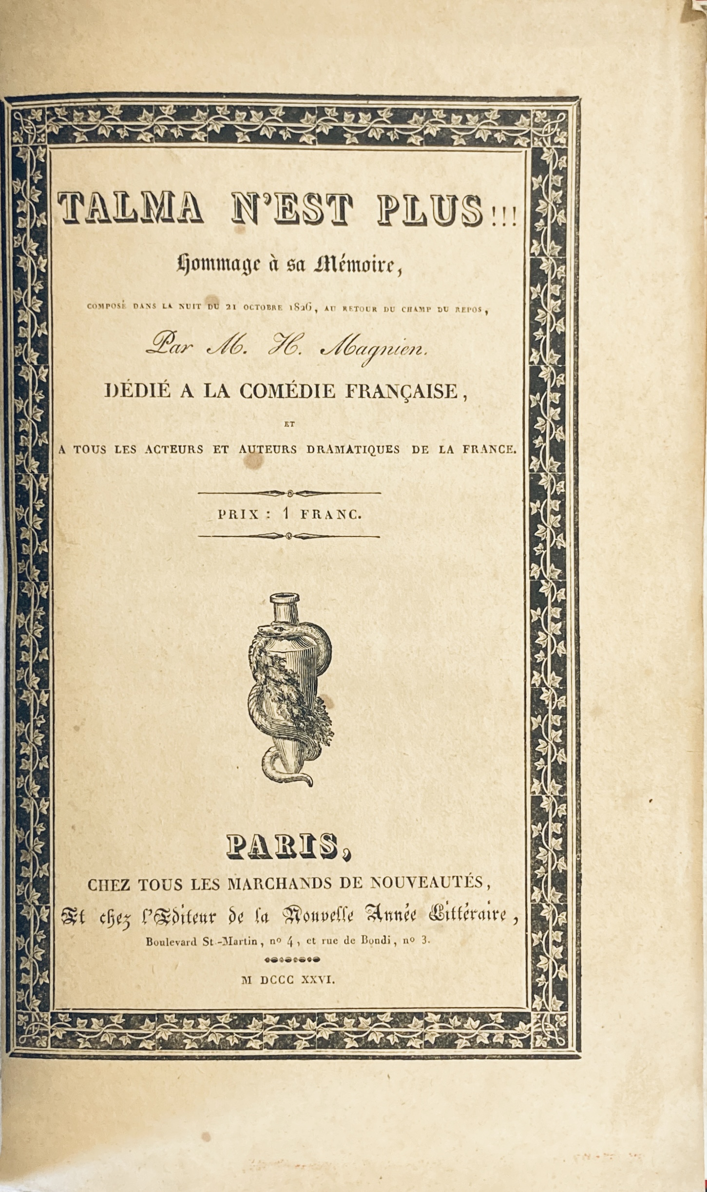 Hippolyte Magnien also authored a number of plays. He was active in the mid-19th century. Hi homage to Talma is listed in only 3 copies in OCLC.